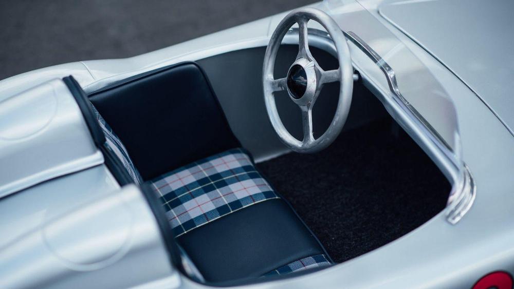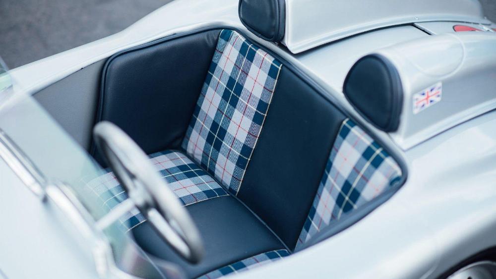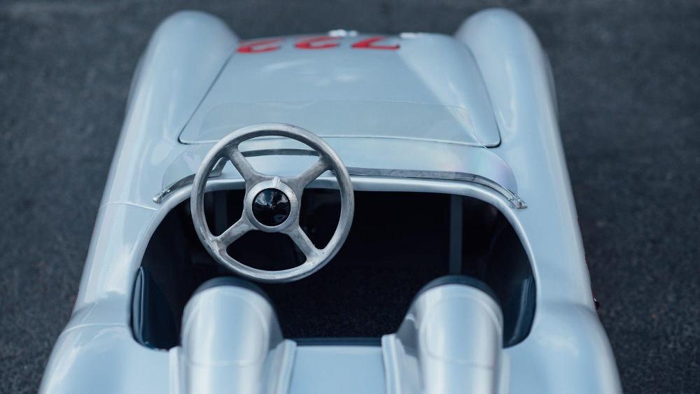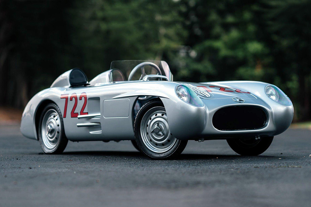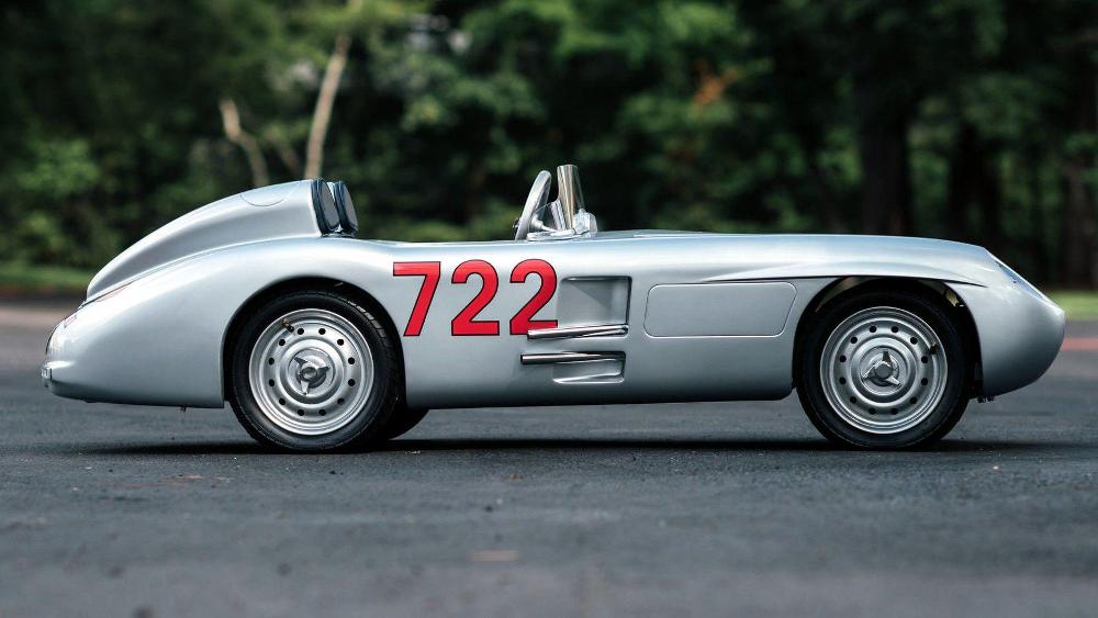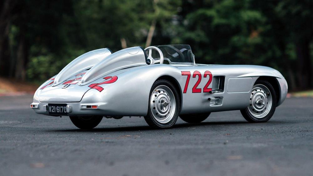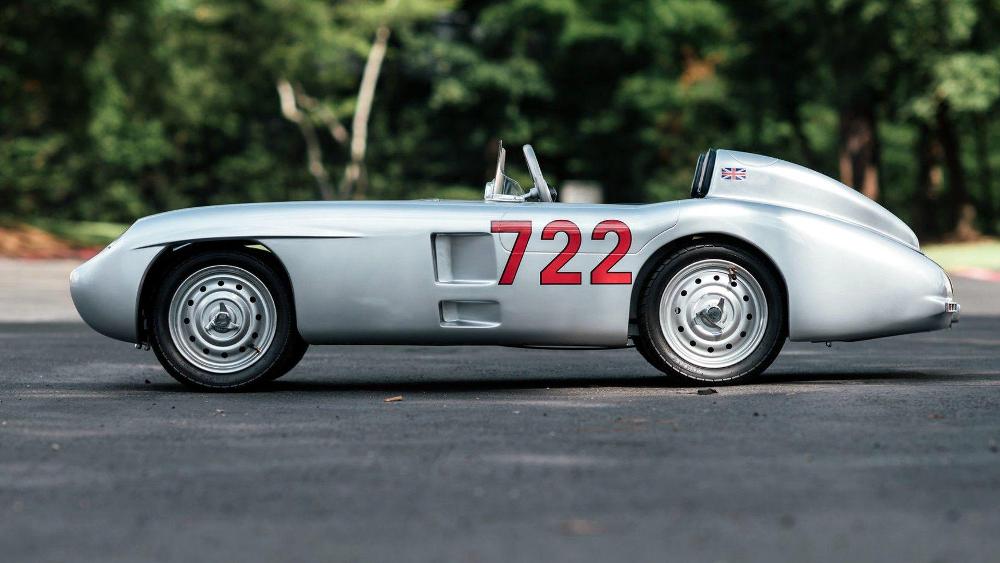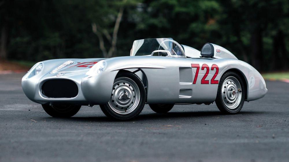 Esta réplica del Mercedes-Benz 300 SLR fue construida a mano en el Reino Unido y combina un chasis de acero con un motor de dos tiempos y 50 cc. La cabina está terminada en cuero cosido a mano y el interior de tela con un volante de aluminio de cuatro radios. Mientras tanto, el exterior está terminado en plata de Mercedes, con llantas de acero de 12 pulgadas y el número “722” grabado en su carrocería. No se ha hecho público su precio estimado de venta.
