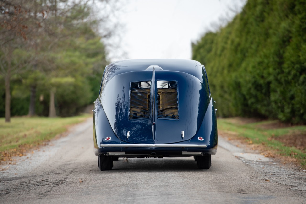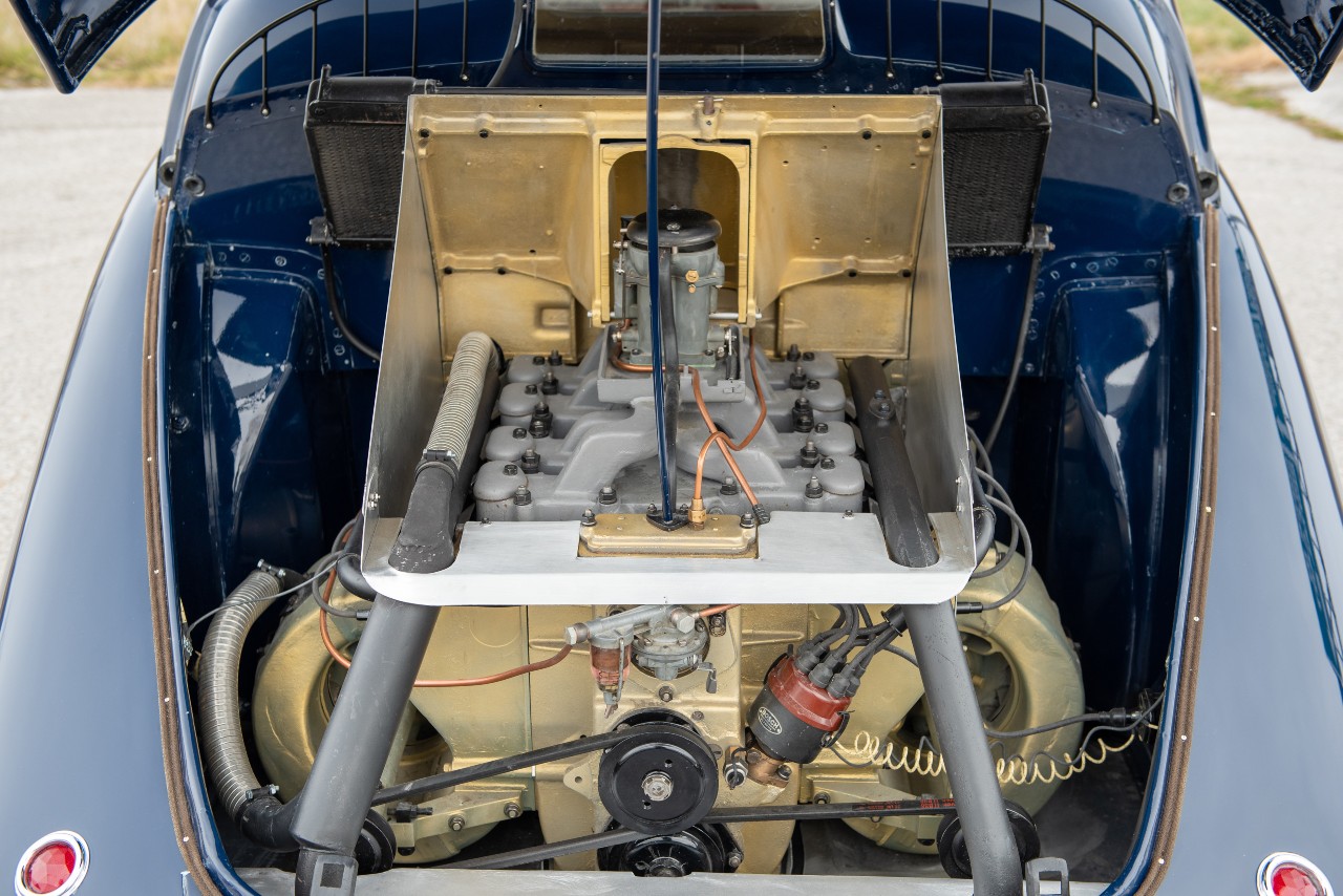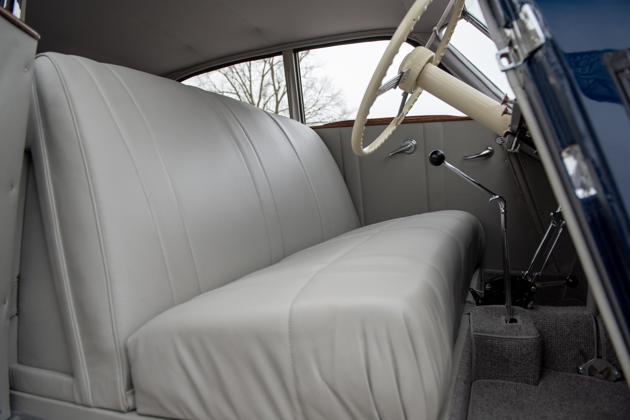 El resultado salta a la vista y es que el coche está inmaculado. El color azul oscuro de la carrocería contrasta con los numerosos cromados, el conjunto, con los faros redondos o el detalle de las ruedas traseras integradas en la carrocería, es propio de la época del Art Decó, el interior está tapizado en cuero gris y el salpicadero de madera, cron cromo y relojes analógicos está impecable.