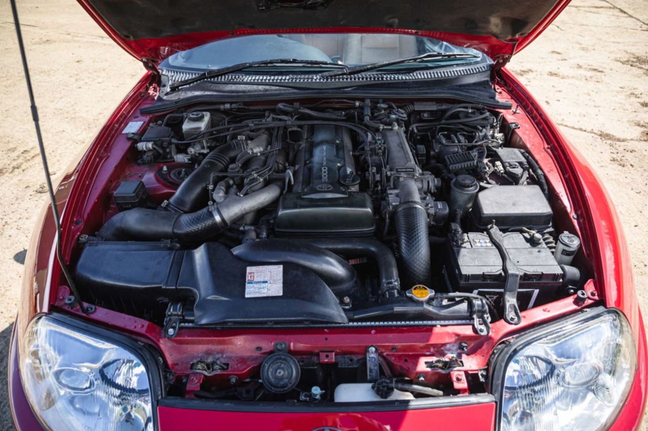 Con especificaciones del Reino Unido (volante a la derecha), este Toyota Supra está equipado con el famoso motor 2JZ-GTE Twin-turbo. Se trata de un bloque de gran reputación entre los amantes de las preparaciones, una mecánica de 3.0 litros y seis cilindros en línea con dos turbocompresores gemelos. Desarrolla 325 CV de potencia y los envía directamente a las ruedas traseras a través de una caja de cambios automática de cuatro velocidades (la menos deseada entre los puristas).