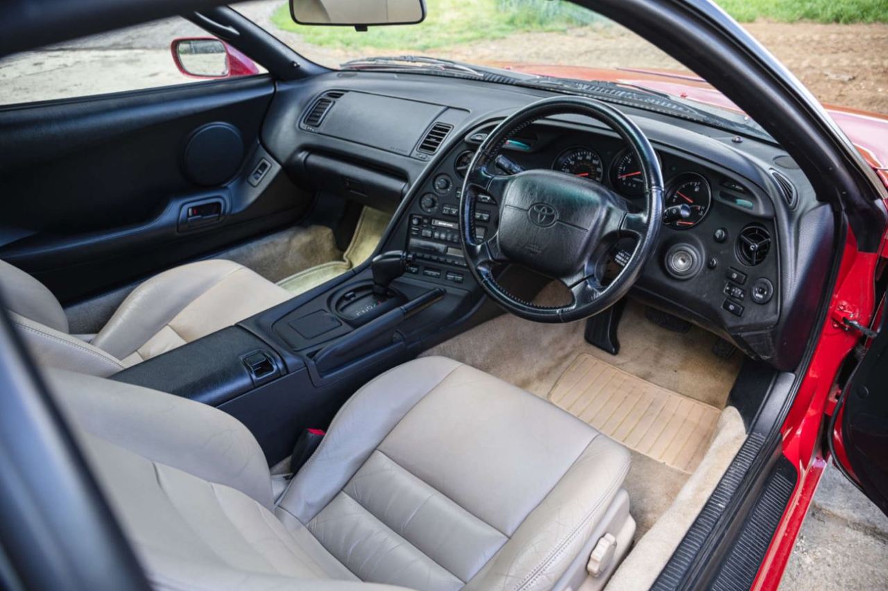 Terminado en color rojo sobre llantas originales de cinco radios, este Toyota Supra de cuarta generación combina con un interior donde los asientos están tapizados en cuero beige, a juego con la moqueta, y el salpicadero, la consola central y los paneles de las puertas son de color negro. El estado general del vehículo es bastante bueno, aunque luce algunos signos de desgaste en el interior, especialmente en los asientos.