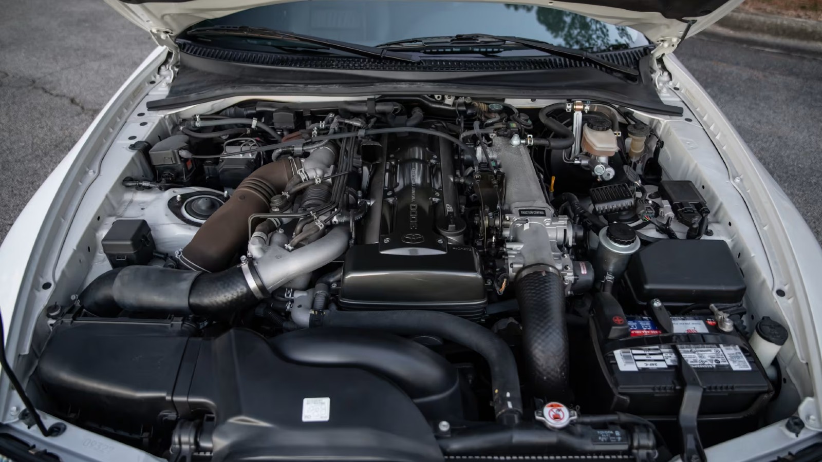 Bajo el capó se encuentra el mencionado motor de seis cilindros en línea 2JZ-GTE biturbo de 3.0 litros de Toyota, un propulsor que contribuyó a consolidar la reputación del Supra en cuanto a rendimiento y durabilidad. De fábrica, producía 325 CV y 427 Nm de par motor, transmitidos a las ruedas traseras mediante una caja de cambios manual de seis velocidades. Con esta configuración, registraba un 0 a 100 km/h en 4,9 segundos y una velocidad máxima limitada electrónicamente a 250 km/h. Se espera que el coche supere los 200.000 dólares en la subasta.