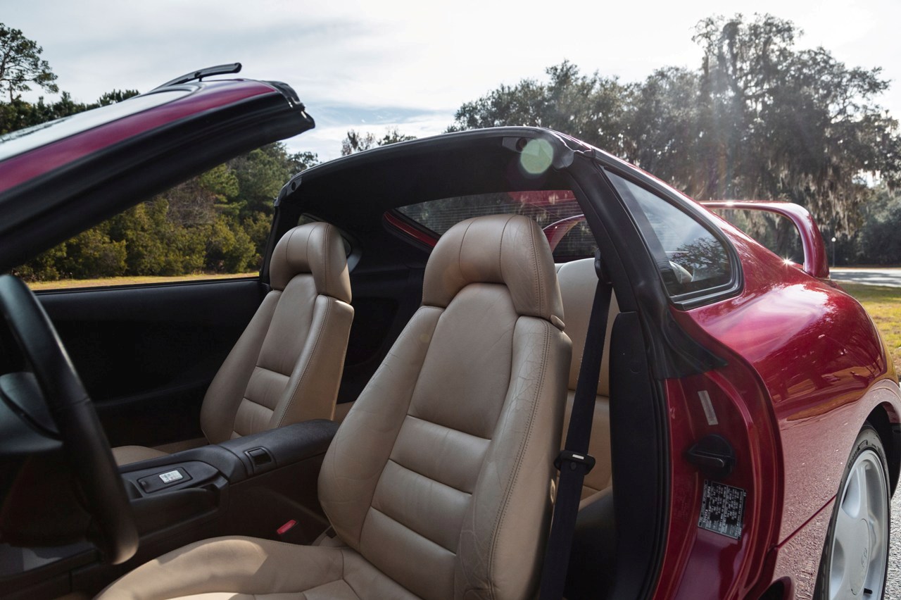 La carrocería está terminada en color de fábrica Renaissance Red sobre unas llantas de aleación originales de 17 pulgadas en diseño de cinco radios anchos. El interior luce cuero Ivory en los asientos originales, que también muestran algunos signos de desgaste típicos en un coche con 29 años. El salpicadero, el volante, la consola central, los paneles de puerta y las alfombrillas están terminados en negro.