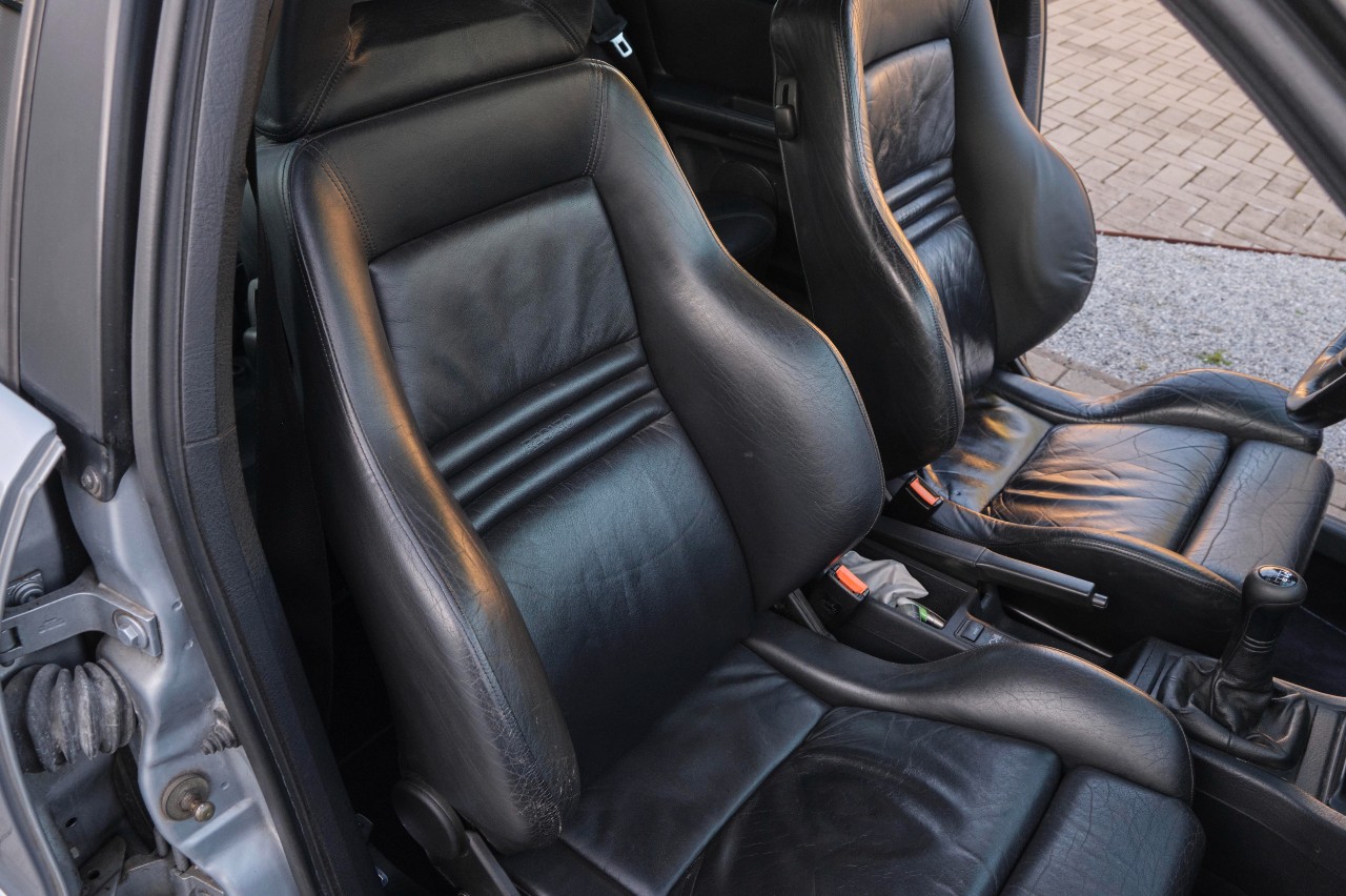 Luce el color Polar Silver en la carrocería, que solo presenta pequeños desperfectos por golpes de chinas que saltan de la carretera; hay algo de corrosión en la parrilla delantera, las llantas ‘Cup’ de 17 pulgadas son las originales, la tapicería de cuero negro muestra señales de desgaste por el uso, pero en términos generales se conserva bien (no se sabe si fueron retapizados en algún momento); pero hay ciertos elementos del habitáculo que deberán arreglarse en el futuro (techo, pomo de la palanca de cambio, etc.).