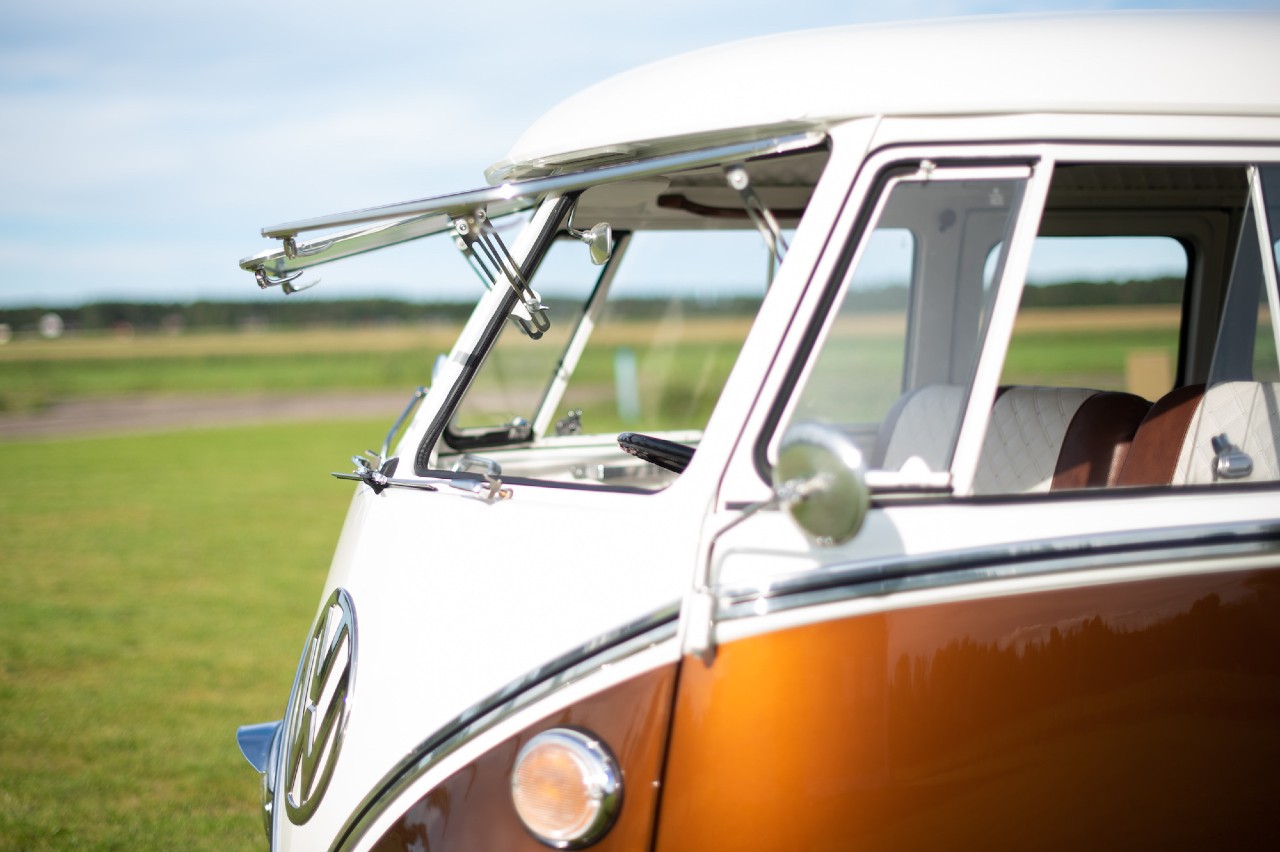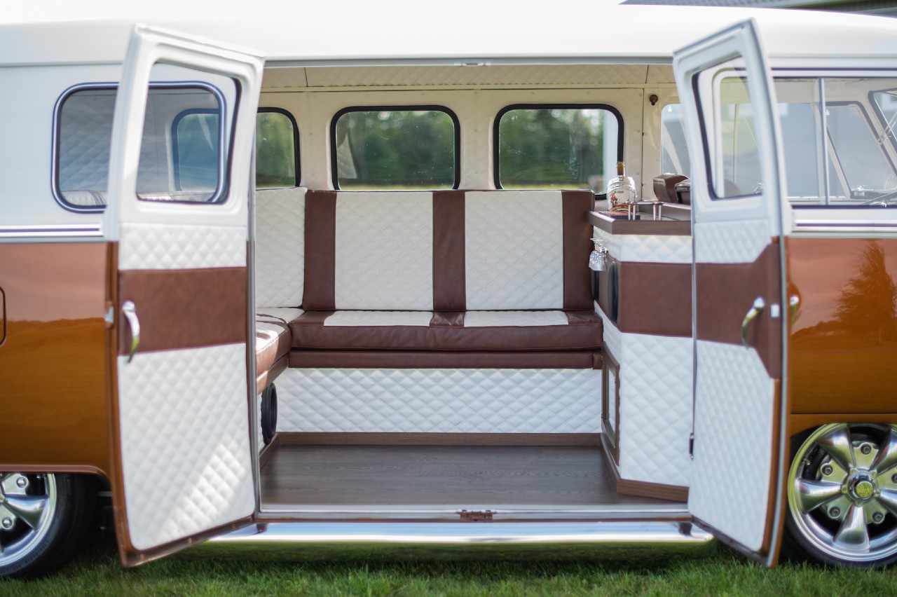 El interior del Volkswagen también fue restaurado por completo, luciendo una tapicería de cuero que repite la combinación cromática exterior, tras el puesto de conducción hay una suerte de minibar y la zona trasera está conformada por un gran sofá con forma de ‘L’.