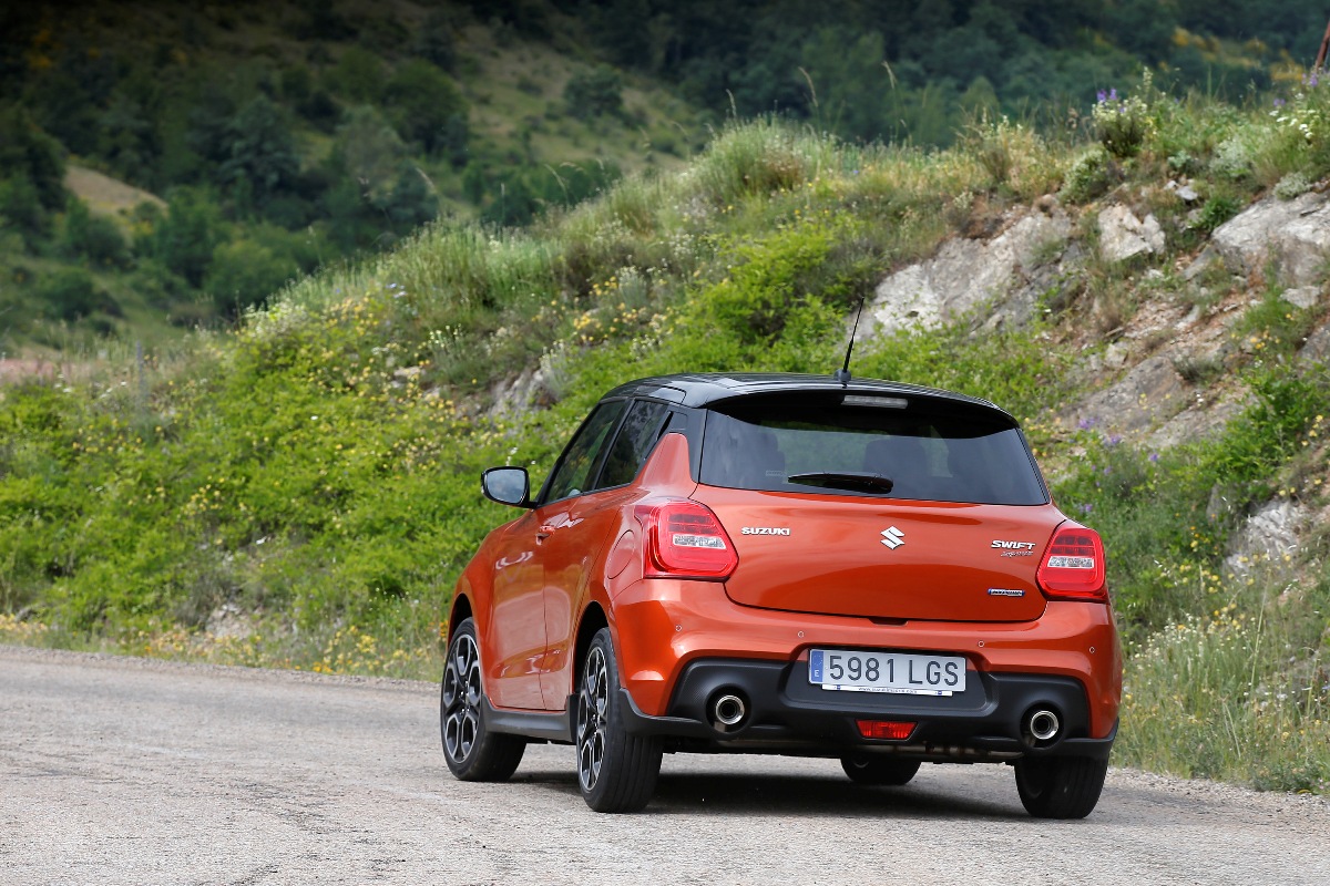 A pesar de que el nuevo Swift Sport no introduce cambios a nivel estético, sigue conservando su estilo deportivo gracias a unos parachoques más agresivos, una parrilla delantera específica, taloneras, un alerón sobre el techo y un gran difusor que integra una doble salida de escape. También son propias las llantas de aleación para esta versión del Suzuki Swift, mientras que la paleta de colores suma las opciones bicolor (con techo y retrovisores en negro) en combinación con las pinturas exteriores rojo Burning, azul Speedy y naranja Flame. Además, luce la denominación Hybrid en el portón del maletero.