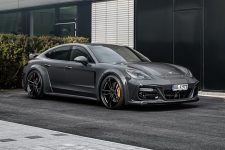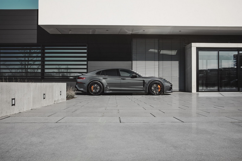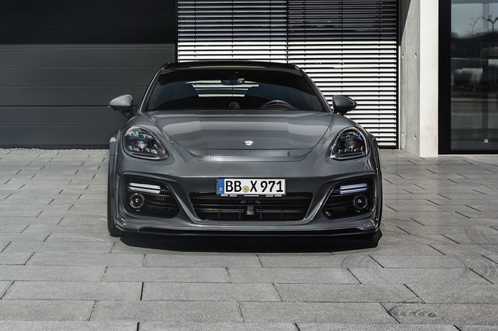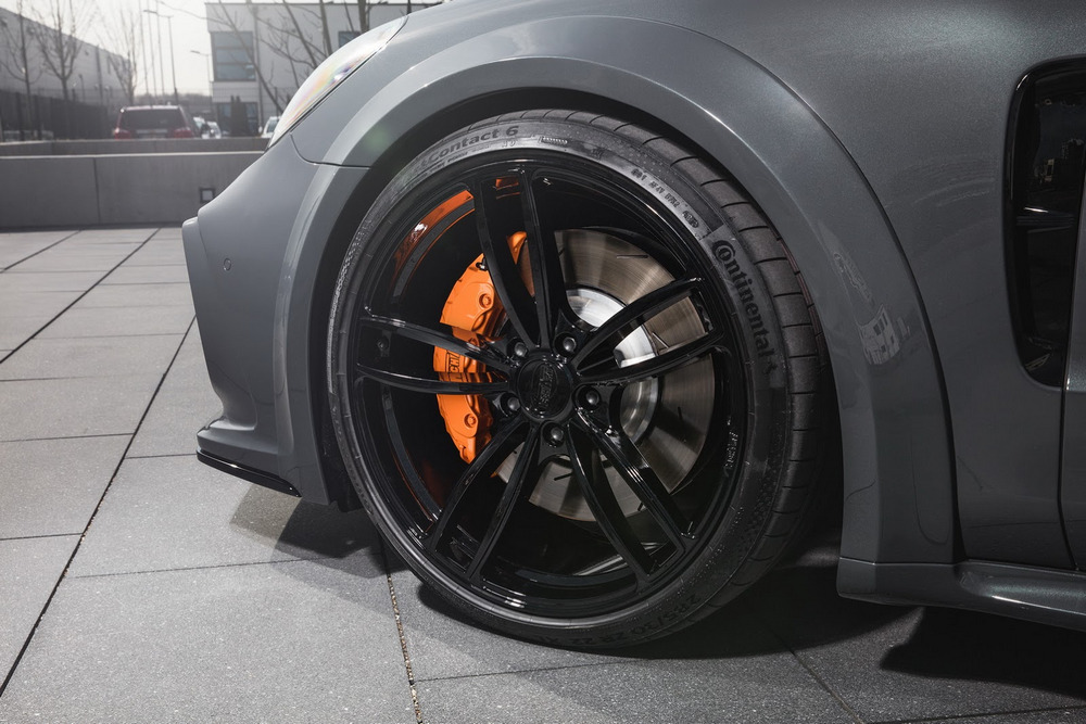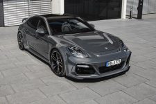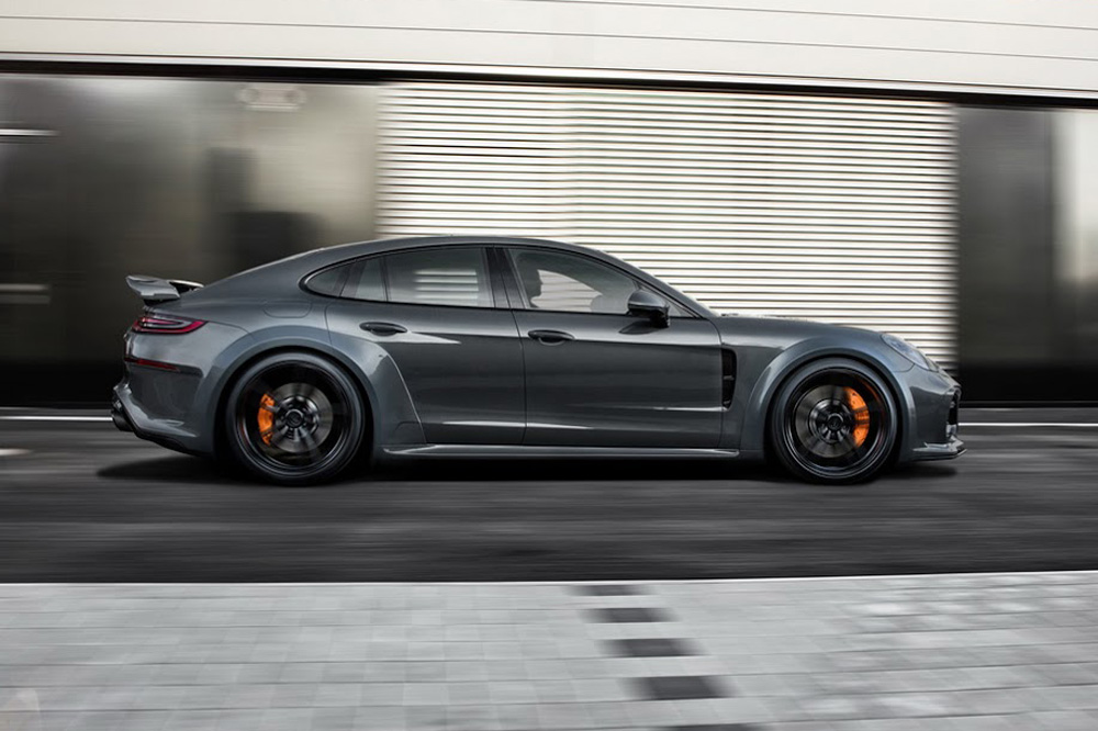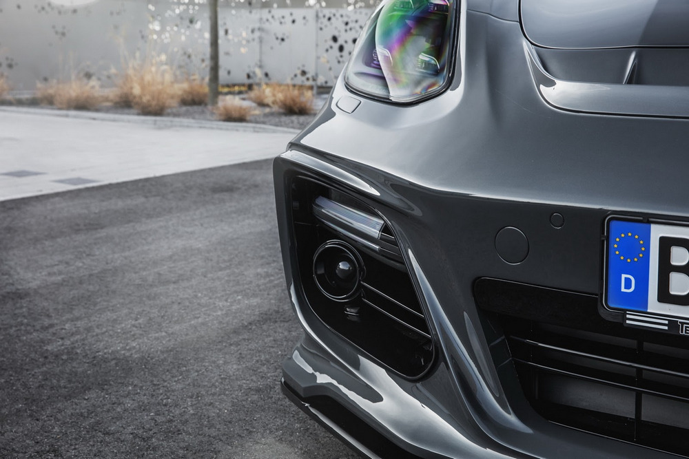 El Porsche Panamera modificado por TechArt llama poderosamente la atención gracias a su musculosa carrocería, elemento que para la ocasión ha recibido unos pasos de rueda ensanchados que aumentan la anchura total del conjunto en nada menos que 80 mm y que al mismo tiempo permite la instalación de unas llantas de 22 pulgadas de diámetro. Todo el paquete aerodinámico de este Porsche está realizado con ligera fibra de carbono y destaca también el nuevo paragolpes delantero, con entradas de aire más grandes, que proporciona una imagen un punto más radical.