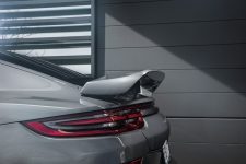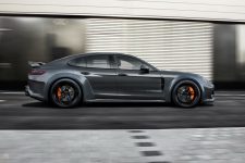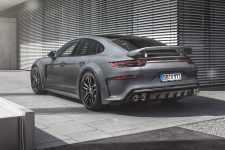 En la zaga, el complejo alerón escamoteable que monta el Porsche Panamera de serie ha sido sustituido por uno fijo de grandes dimensiones, elemento que junto con el nuevo difusor posterior, contribuye a pegar el coche al asfalto a altas velocidades. En esta zona, el nuevo TechArt GrandGT también incorpora un nuevo sistema de escape de alto rendimiento con cuatro salidas, elemento que está realizado íntegramente en titanio para ahorrar peso sin comprometer la resistencia.