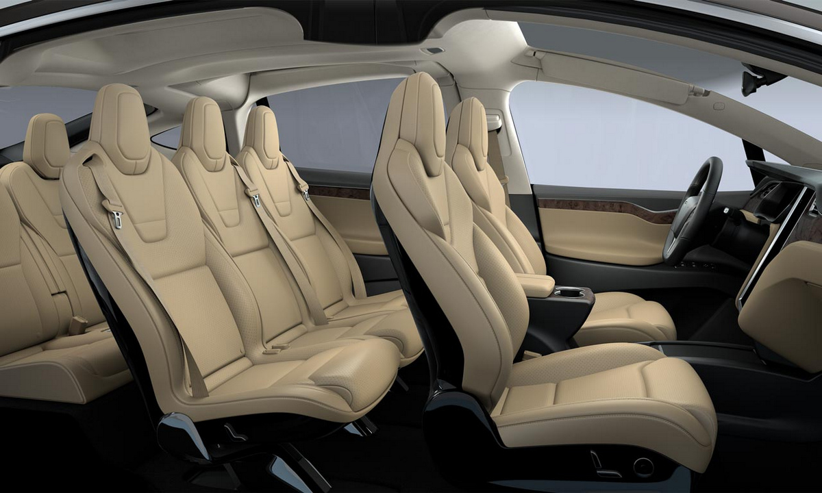 En el habitáculo, Tesla ha dispuesto dos configuraciones predeterminadas para el nuevo Tesla Model X: una variante de seis plazas (2+2+2) y otra versión de siete plazas (2+3+2). Cuando no son necesarios, los asientos de la última fila se pueden plegar, lo que aumenta considerablemente la capacidad del maletero principal (tiene también otro maletero en la parte delantera, como el Model S). El salpicadero, como en la berlina, está presidido por una pantalla de dimensiones colosales.