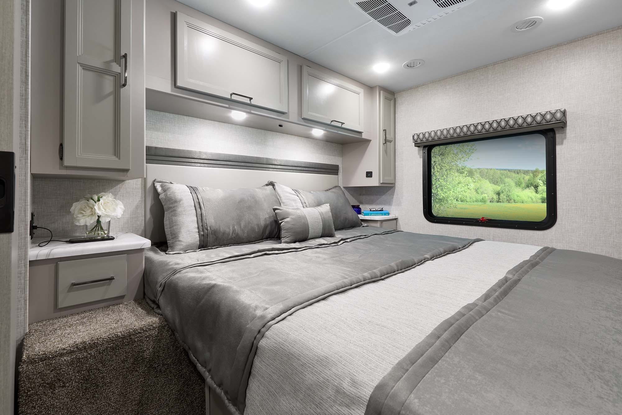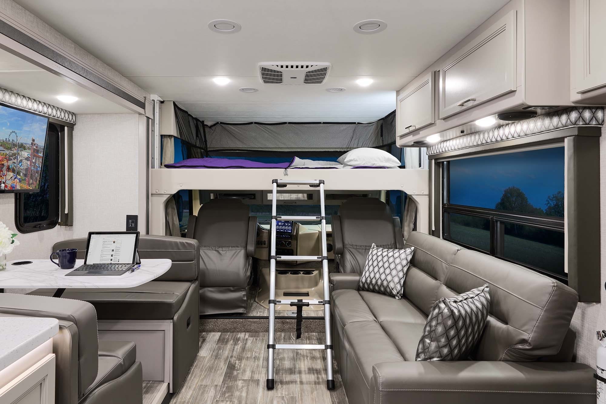 Equipada con un espacio versátil en el centro del vehículo, la Thor Hurricane cuenta con una sala de estar con un centro de entretenimiento y sofás, así como asientos giratorios delanteros que ofrecen espacio adicional para disfrutar acompañado. También hay una cocina totalmente funcional y varios dormitorios. El principal cuenta con un sofá modular que se convierte en cama de dos plazas, mientras que en el resto del vehículo hay una cama desplegable en la parte superior de la cabina de conducción o literas, en función de la versión.