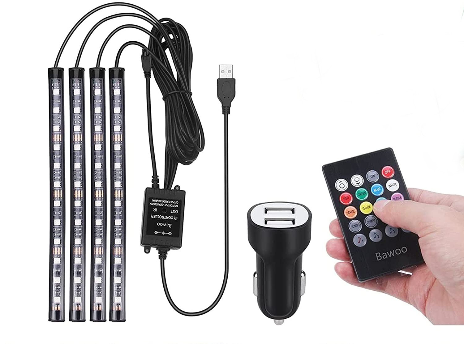 Son básicamente tiras LED que puedes enchufar en el encendedor del coche. Lo mejor de estas luces es que tienen 4 modos para la música, es decir que cambiarán de color según el ritmo. Vienen con un mando para que cambies de color cuando quieras, lo más seguro es que lo hagas cuando estés parado, así evitarás accidentes.