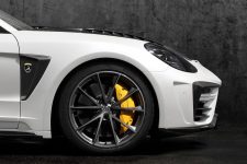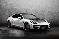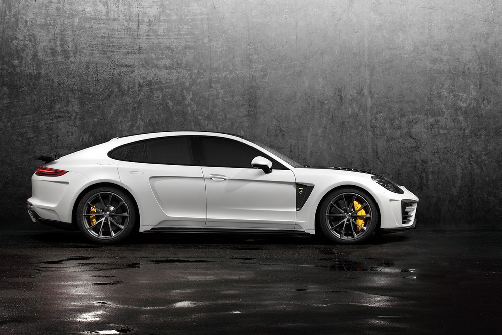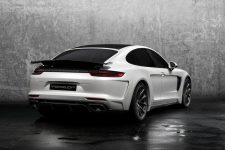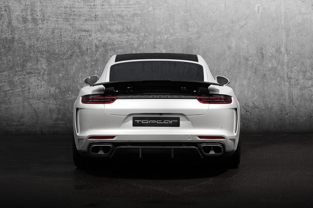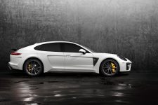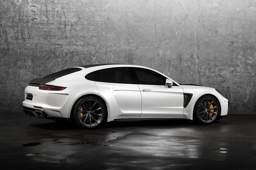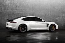 Una solución similar a la vista en el Tesla Model S (prueba) o en el recientemente introducido Range Rover Velar (curiosamente, los tiradores delanteros los han dejado tal cual). El Porsche Panamera modificado por TopCar cuenta con un paragolpes delantero diferente, con entradas de aire más grandes. También hay un capó distinto, con un par de branquias que lo recorren longitudinalmente. Los pasos de rueda son más anchos e integran entradas y salidas de ventilación en ambos trenes, acogiendo en su interior un juego de llantas de mayor diámetro, firmadas por HRE, ADV.1 o 1221.
