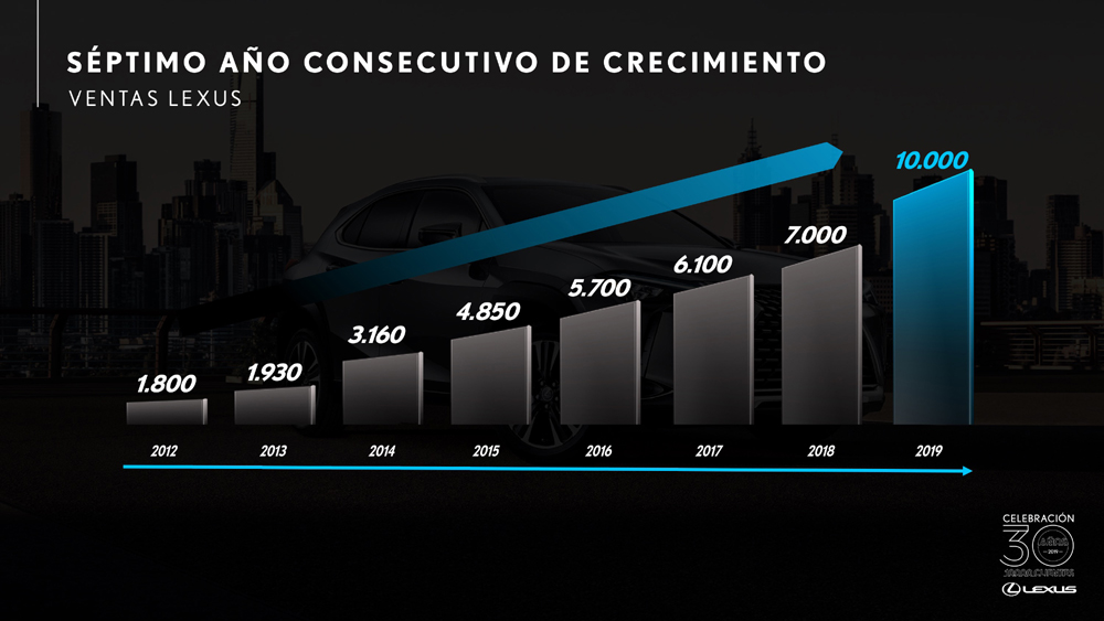 Las 10.000 unidades de Lexus permitirán que la marca de lujo alcance su séptimo año de crecimiento consecutivo. Con respecto a 2018, esa cifra de ventas supone un incremento de nada menos que el 43% y de cara al próximo año, buscarán consolidar esa cifra apoyados en el éxito del UX y del ES y en los próximos lanzamientos, que incluyen el primer automóvil 100% eléctrico, el UX 300e, y el llamativo Lexus LC Cabrio.