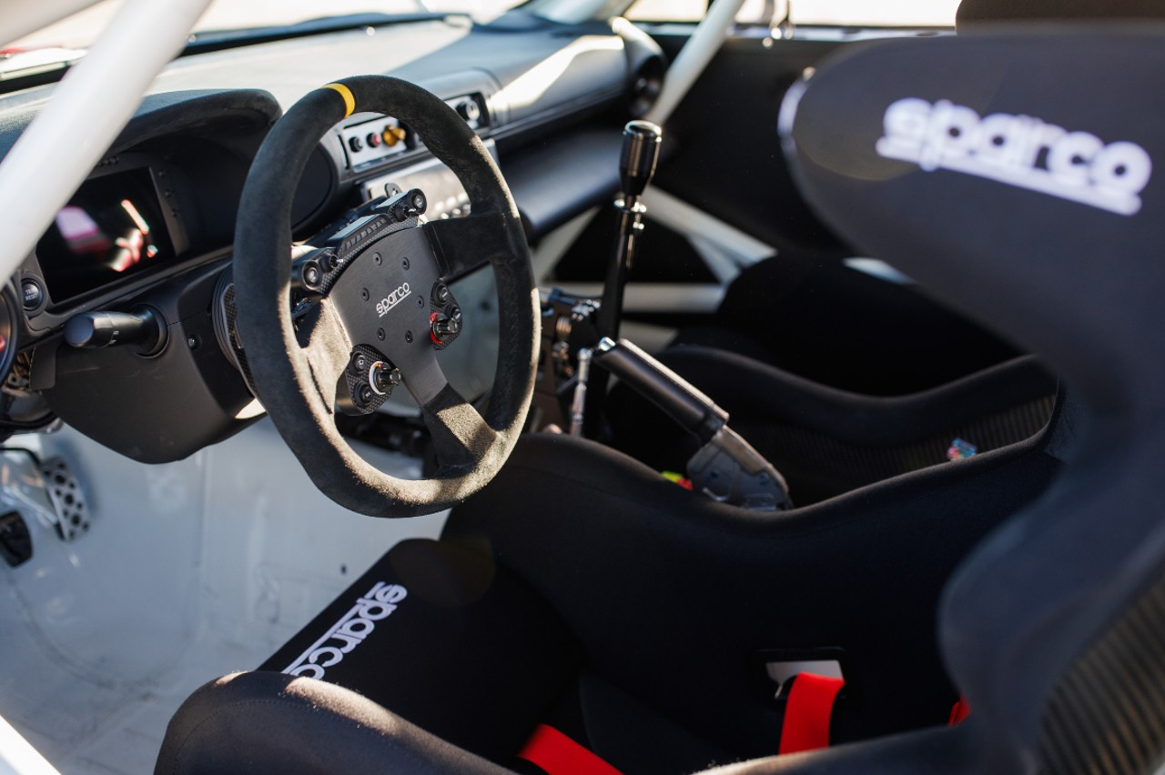 El trabajo estético ha sido impecable en el GR86 Rally Legacy. Tiene una pintura Halo White y detalles en rojo y verde que evocan al Celica GT-Four, así como unas faldillas guardabarros rojas y un escape personalizado que sale por donde normalmente iría la matrícula. También tiene un alerón con una curvatura similar a la que tenía el Celica de rally y un juego de luces de rally en la parte delantera. Dentro tiene una jaula antivuelco completa y asientos de competición con arneses rojos de seis puntos.