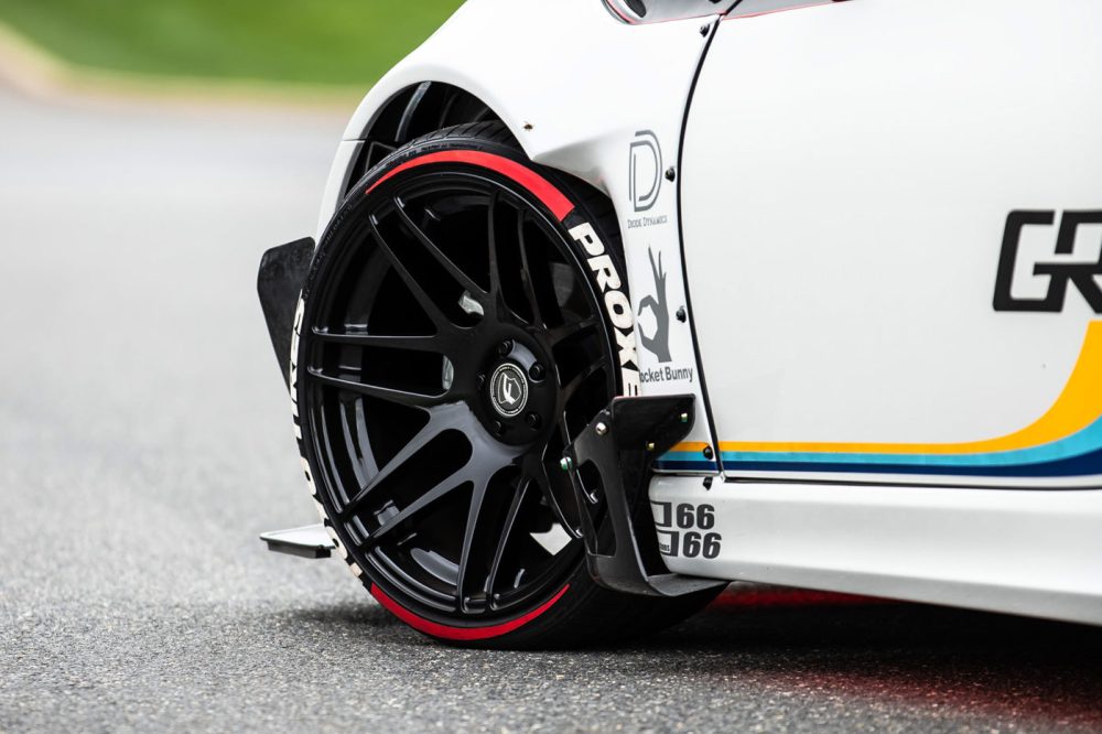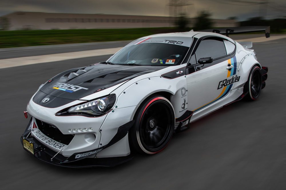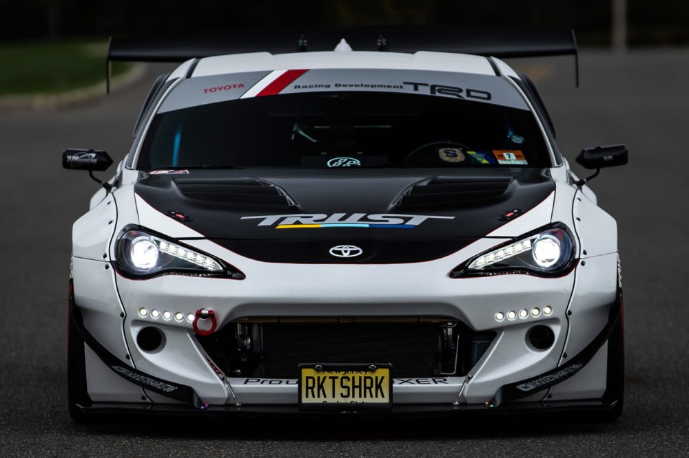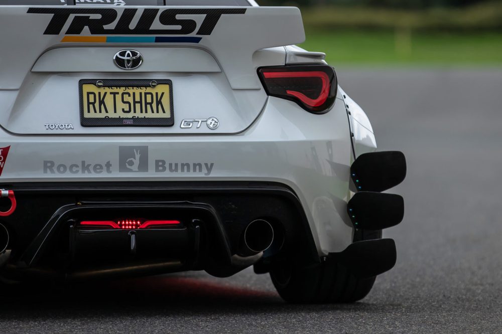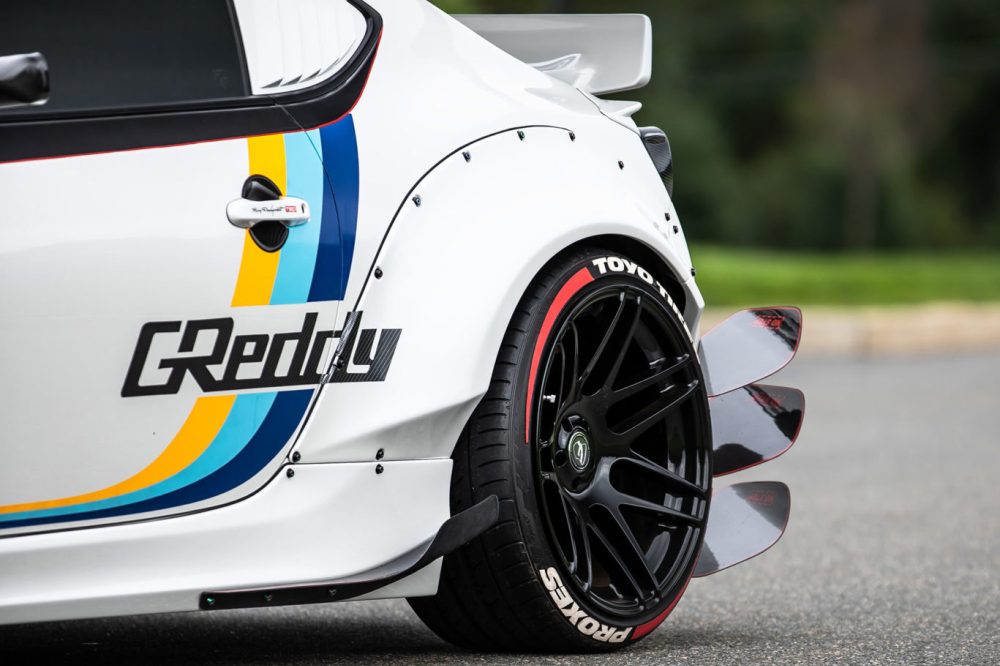 El exterior de este Toyota GT86 (prueba) luce el kit de carrocería V2 del preparador asiático, al cual se le han añadido unos canards en la parte delantera y trasera de la carrocería. El parachoques delantero también incluye un kit Greddy LED y un splitter APR de fibra de carbono, mientras que el capó de fibra de carbono con entradas de aire reemplaza al original. La zaga, mientras tanto, incluye un gran difusor y un alerón trasero de gran envergadura. Todo el conjunto se asienta sobre un juego de llantas Forgestar F14 de 19 pulgadas con neumáticos Toyo.