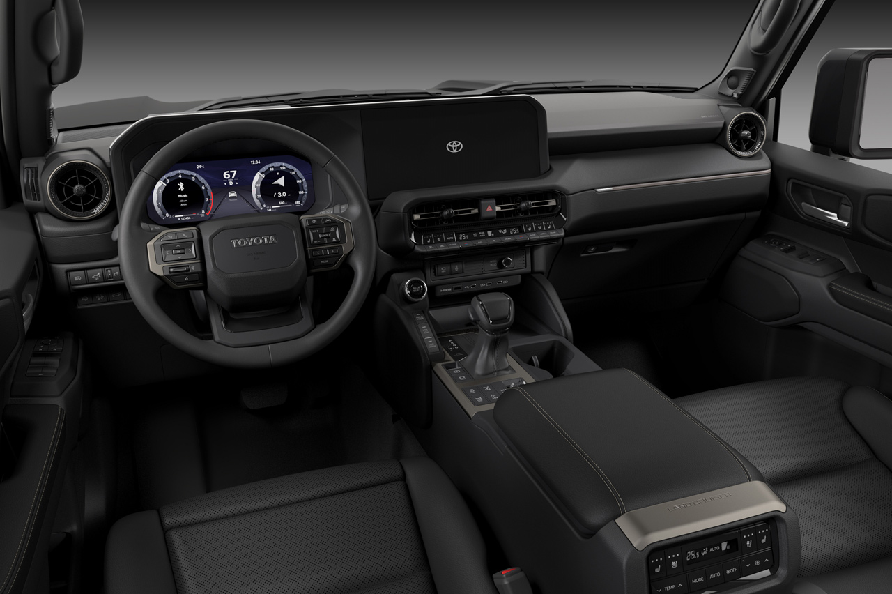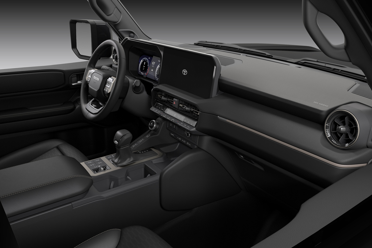 Destacan también los grupos ópticos, que se ofrecen con dos configuraciones: una más actual de aspecto cuadrado (que recuerda al diseño del Land Cruiser J60) y otra más ‘retro’ con faros redondos (un guiño a los Land Cruiser J70 o J40). Toyota también hace hincapié en el hecho de que han aumentado la superficie acristalada al tiempo que han reducido el grosor de los pilares para mejorar la visibilidad y la luminosidad que llega al habitáculo.