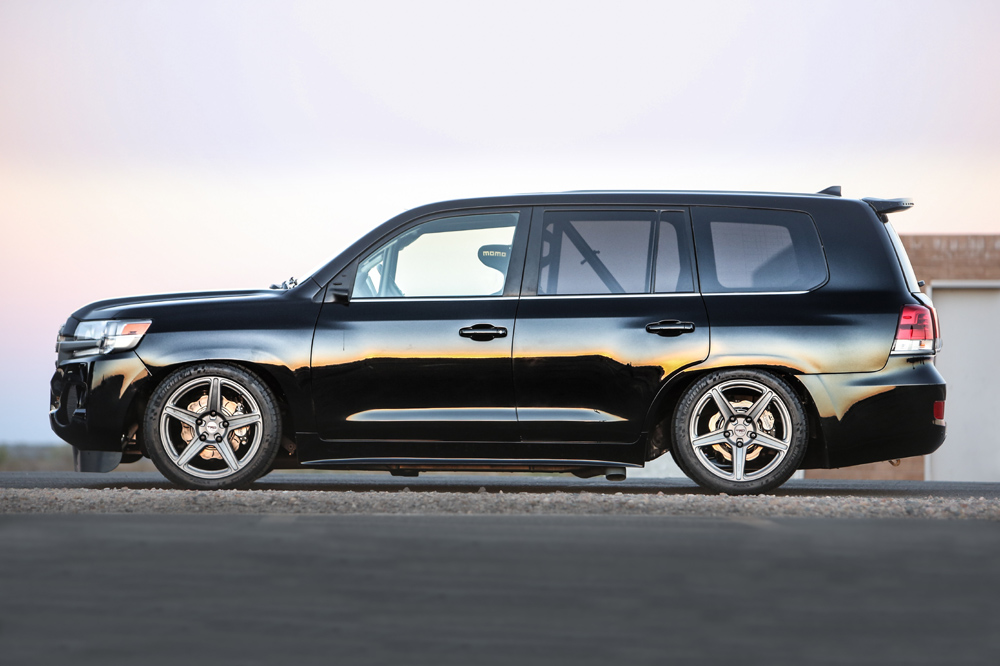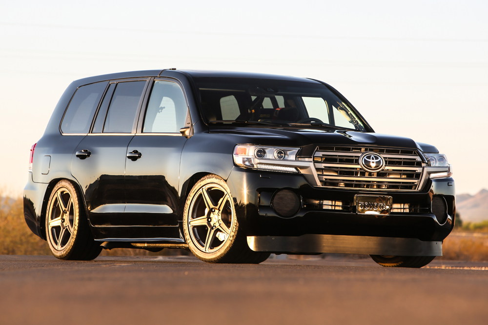 Como podrás deducir por su denominación, el Land Speed Cruiser que ha creado la firma japonesa para el SEMA 2016 es un vehículo que apuesta por la velocidad. Visualmente, queda claro que no estamos ante un Toyota Land Cruiser 200 convencional: su carrocería está mucho más cerca del suelo, cuenta con sutiles modificaciones aerodinámicas (un faldón delantero más prominente, han eliminado los retrovisores…), unos anchos neumáticos deportivos o una zaga que integra un generoso difusor en su parte inferior.