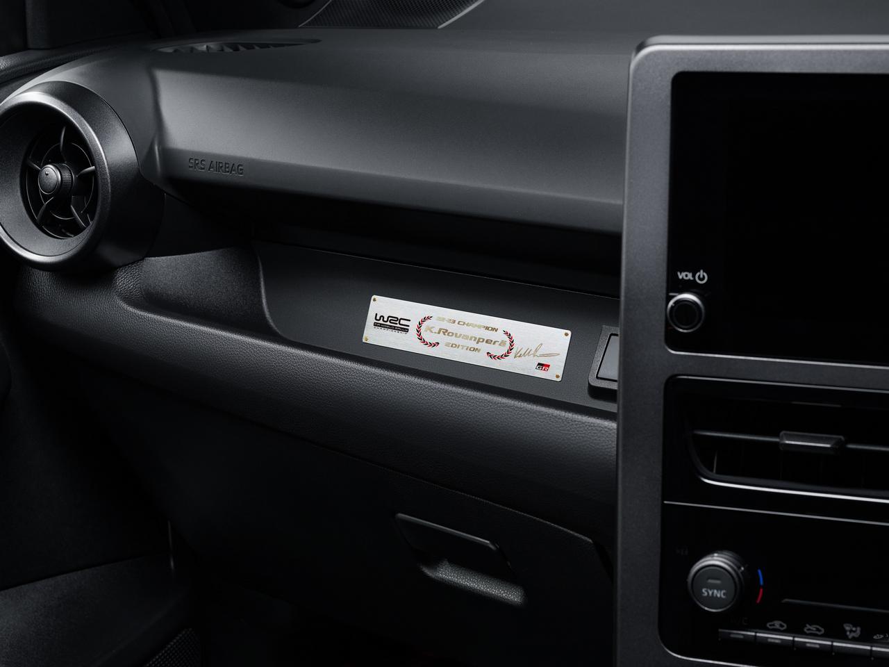 En cuanto al habitáculo del GR Yaris de Kalle Rovanperä, hay una serie de acabados y detalles en la tapicería con los colores azul y blanco en homenaje a la bandera finlandesa, país natal de Kalle. Y para completar el conjunto, una placa conmemorativa de la victoria lograda por el piloto con el Toyota Gazoo Racing World Rally Team (TGR-WRT).