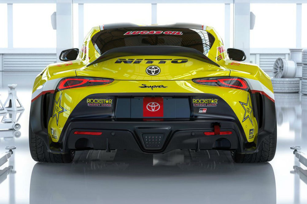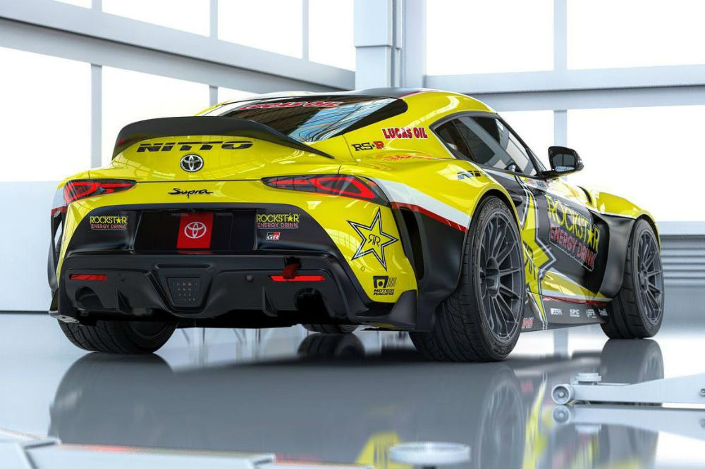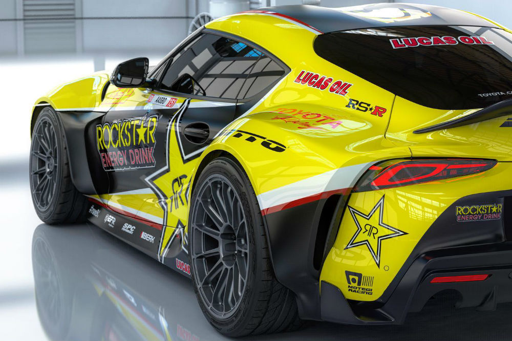 Su imagen es poderosa, para empezar, por el llamativo vinilo con los colores amarillo y negro de Rockstar Energy Drink, pero también por el kit de carrocería que monta el Toyota, que ensancha claramente los pasos de rueda para dar cabida a unas llantas específicas y para facilitar el hueco necesario para hacer derrapes con el ángulo deseado.