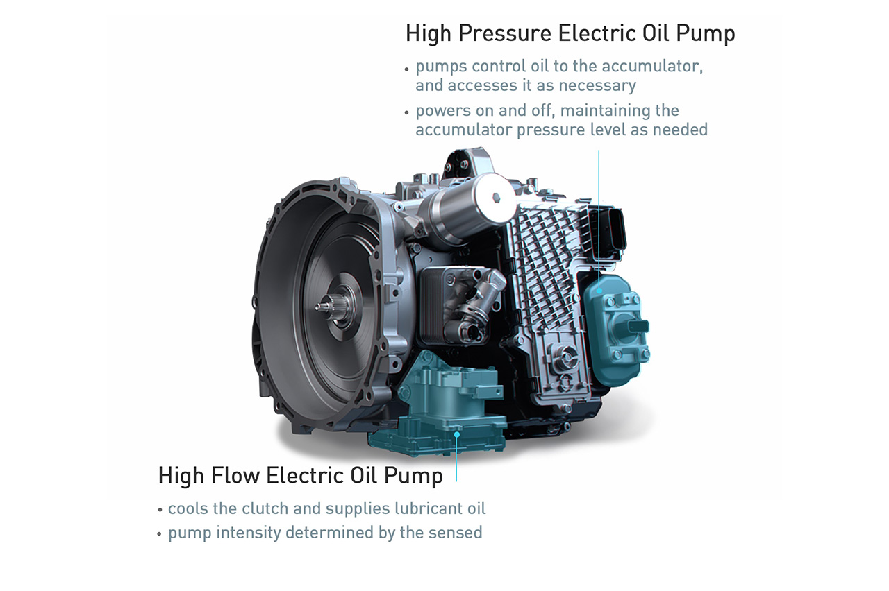 El sistema de bombas eléctricas está compuesto por una bomba de aceite de alto caudal y otra de alta presión. Se encargan de la lubricación de los engranajes y la refrigeración del embrague, y de suministrar aceite al acumulador y mantener una presión elevada para el cambio de marchas, respectivamente. Estas características permiten a la transmisión N DCT que sea óptima para aplicaciones en vehículos de alto nivel de par. Cuando se exige mayor rendimiento a la transmisión, por ejemplo, en conducción en circuito, el embrague siempre se mantiene a temperatura óptima, evitando el sobrecalentamiento.