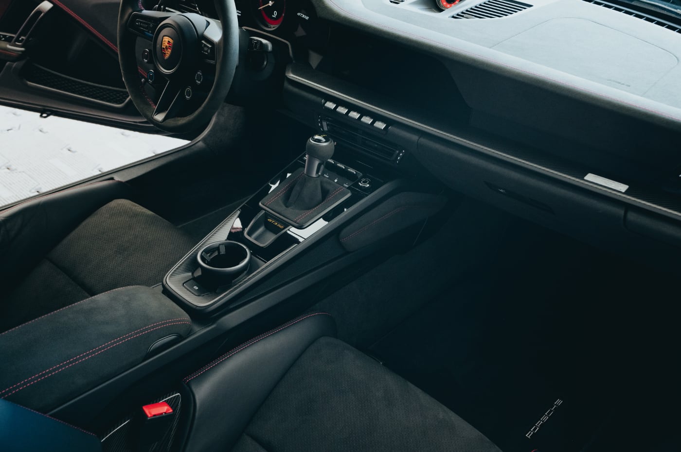En su interior, tapicería en cuero negro y piel vuelta con costuras en Guard Red en unos espectaculares asientos deportivos que los vimos por primera vez en el (prueba) Porsche 918 Spyder y que los hemos probado la última en el Porsche 718 Cayman GT4 RS y Porsche 718 Spyder RS.