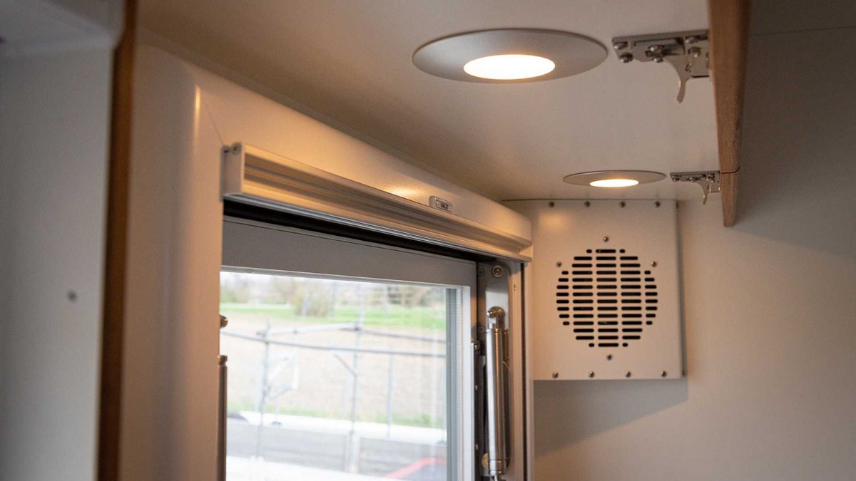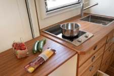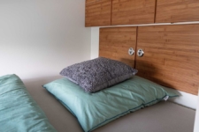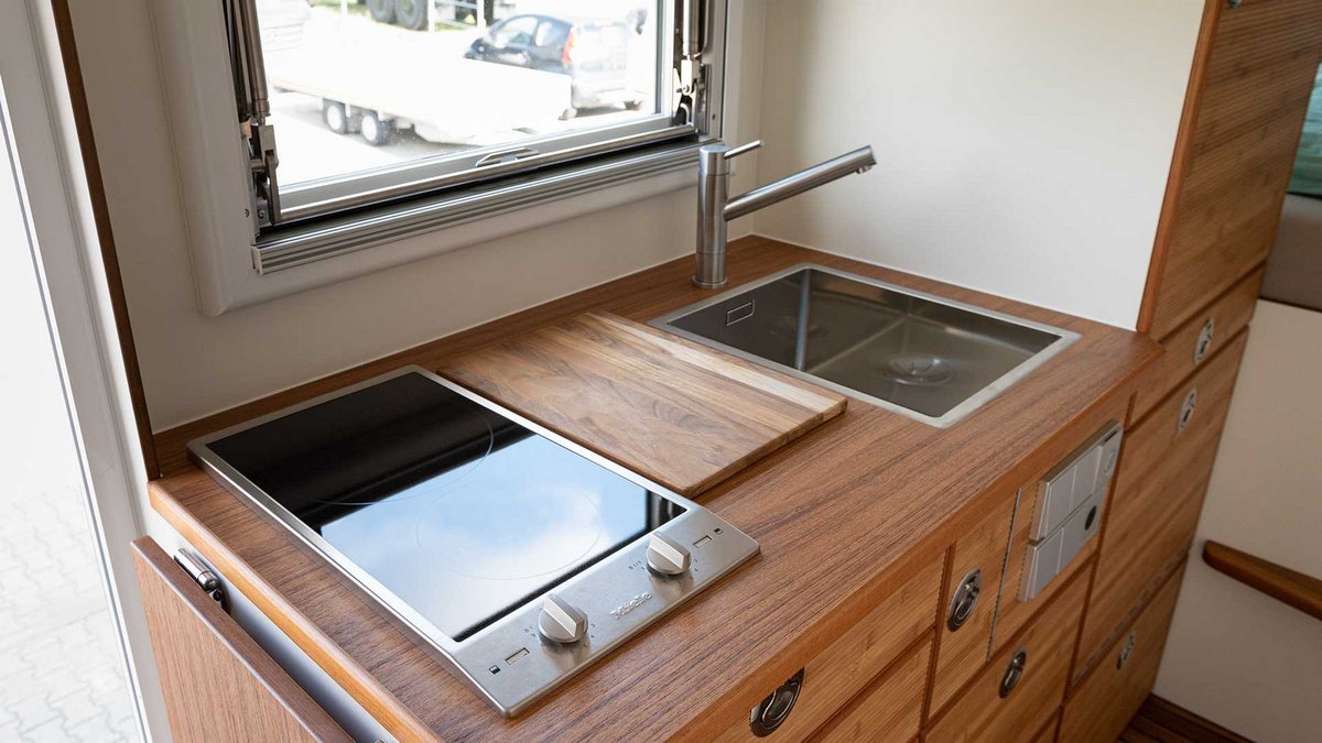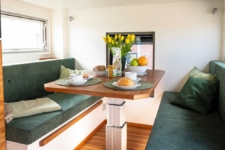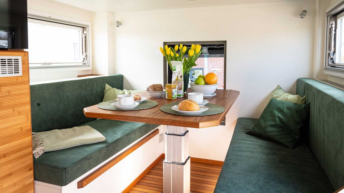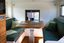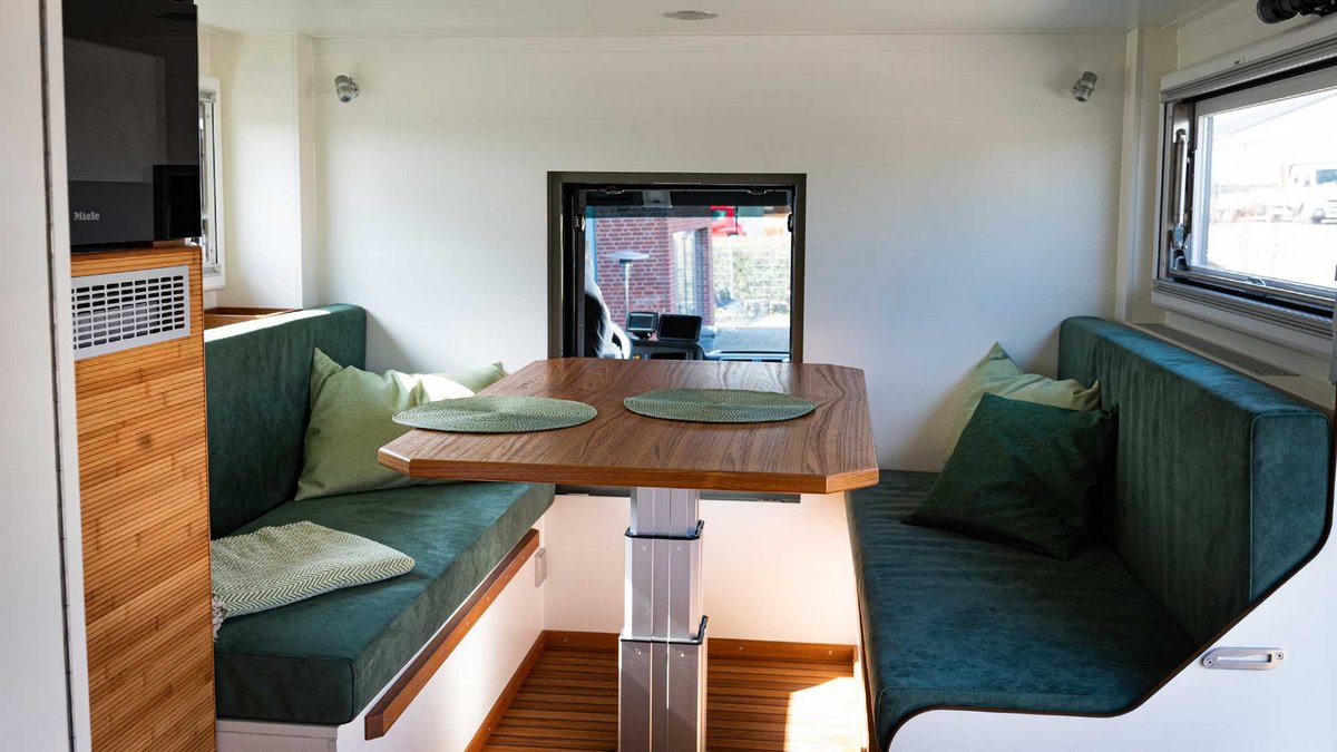 Las paredes, de 6 cm de espesor, cuenta con un aislamiento térmico para soportar todo tipo de climas. Aunque como podrás imaginar, también incorpora un potente sistema de climatización con aire acondicionado y calefacción. El interior, que está rematado en gran parte con madera de teca o bambú, incluye una zona de estar con capacidad para seis personas y una mesa que puede bajarse con tan solo presionar un botón para formar una cama de matrimonio.
