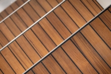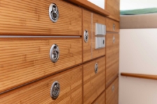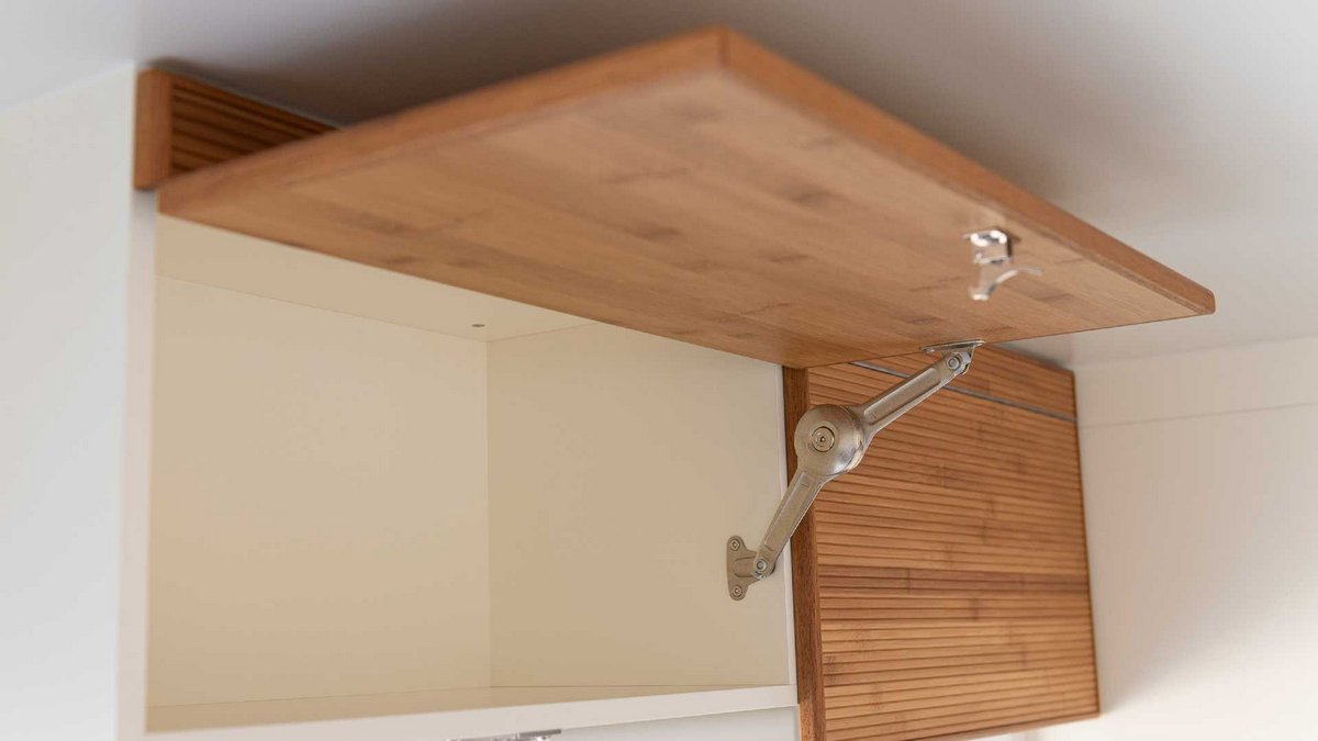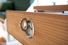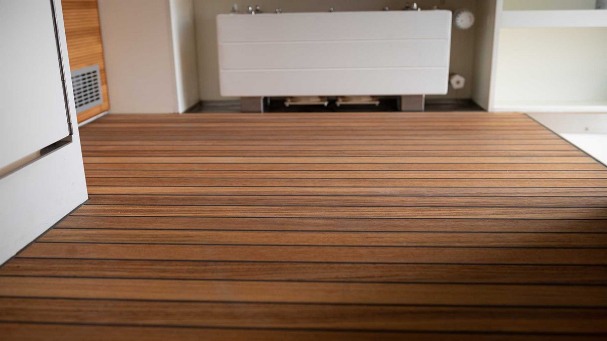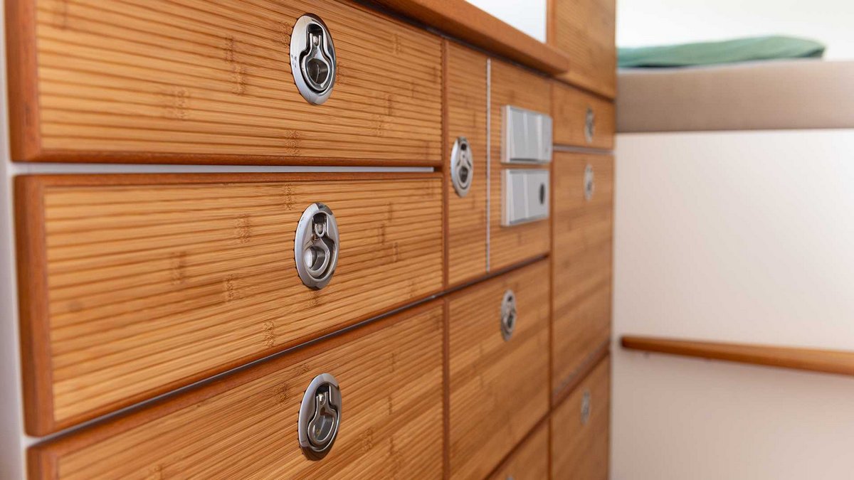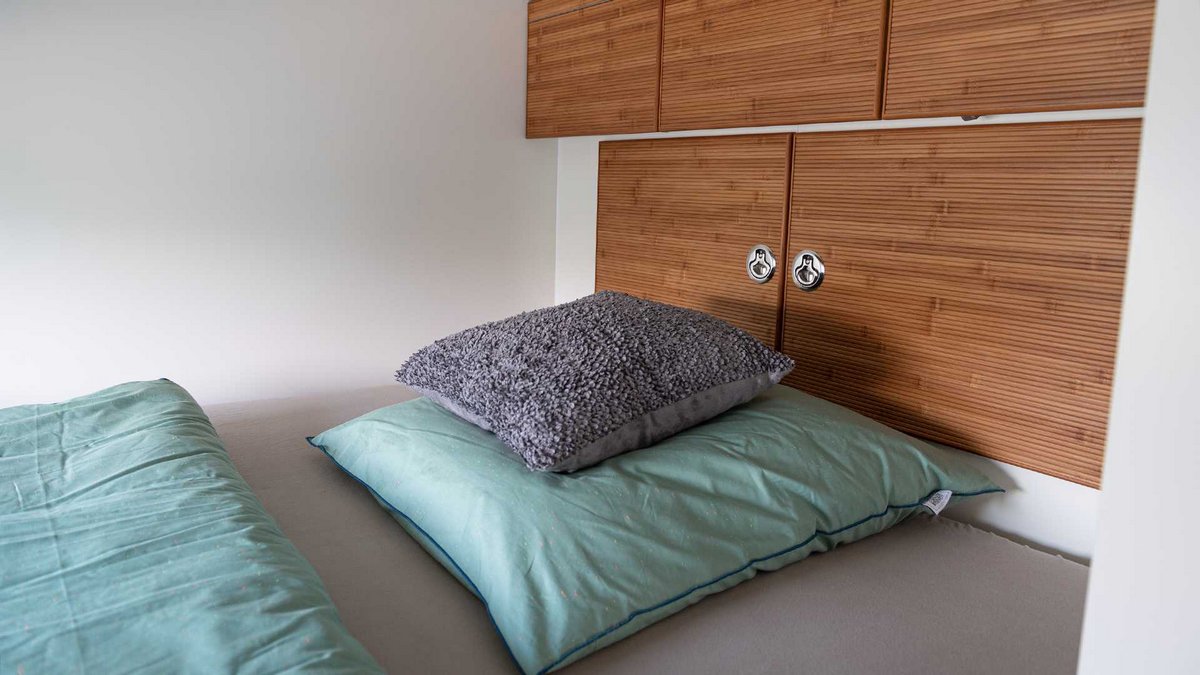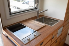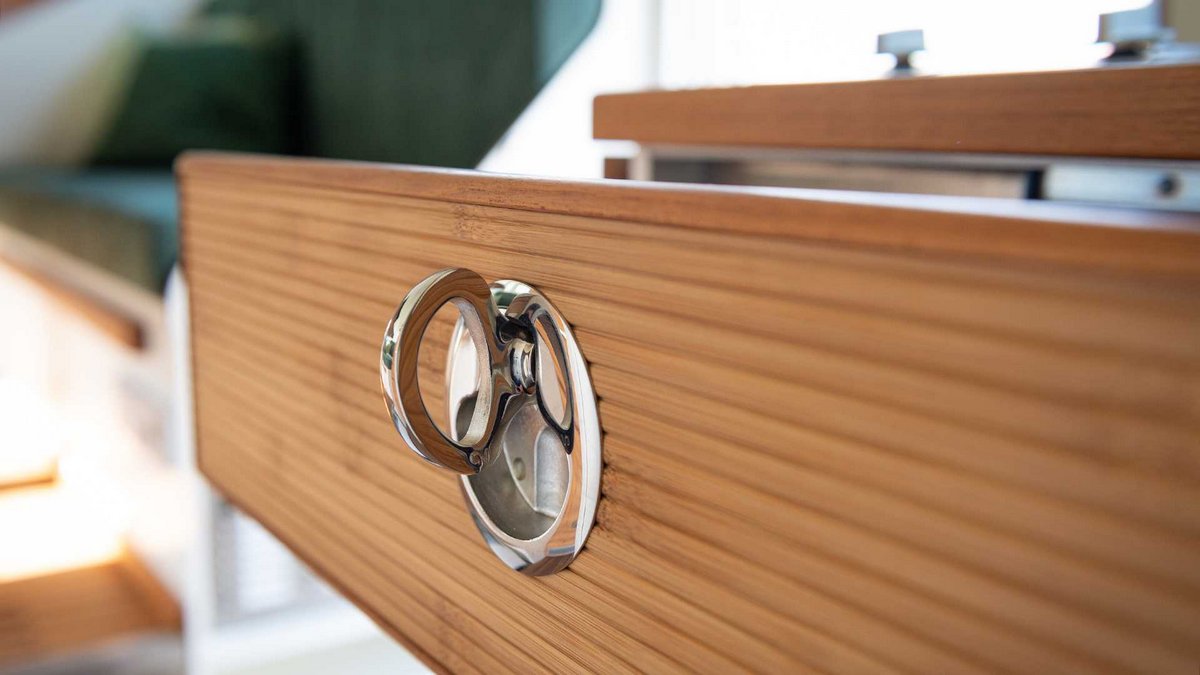 Las paredes, de 6 cm de espesor, cuenta con un aislamiento térmico para soportar todo tipo de climas. Aunque como podrás imaginar, también incorpora un potente sistema de climatización con aire acondicionado y calefacción. El interior, que está rematado en gran parte con madera de teca o bambú, incluye una zona de estar con capacidad para seis personas y una mesa que puede bajarse con tan solo presionar un botón para formar una cama de matrimonio.