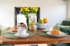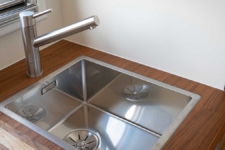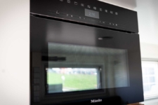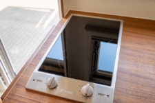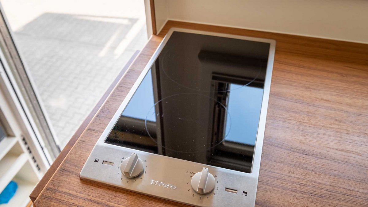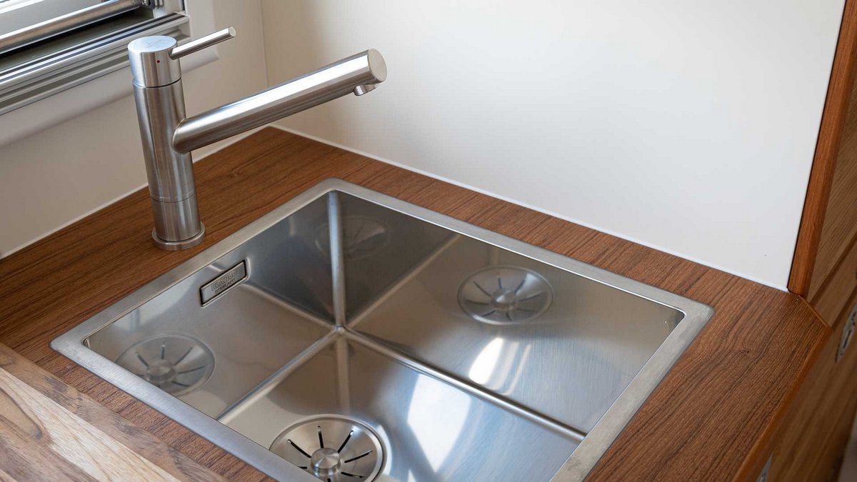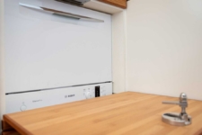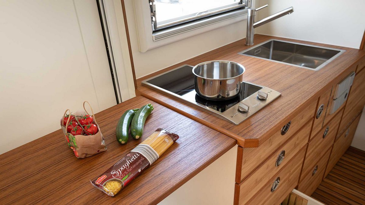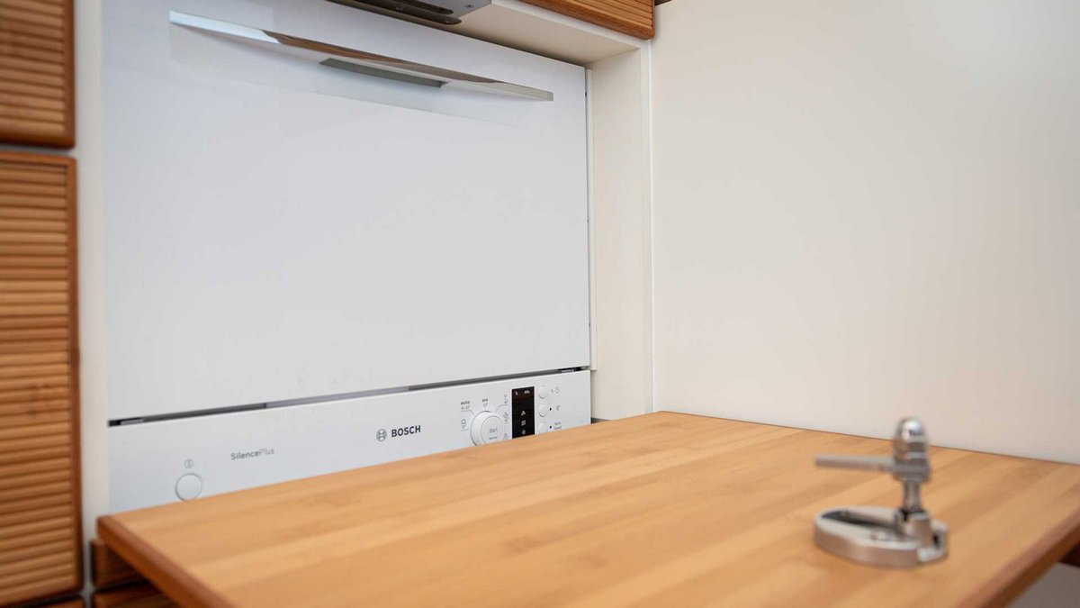 En la cocina, que está justo a continuación, nos encontramos con un fregadero, una placa de inducción, un microondas, un lavavajillas y una nevera y un congelador, además de múltiples cajones y espacios para almacenar menaje y comida. Lo siguiente que encontramos, continuando de la parte delantera a la trasera, es un baño completo con ducha separada. Justo después está el dormitorio principal, con una cama de 2 x 1,6 metros.