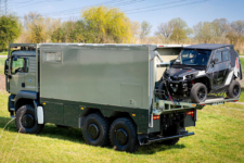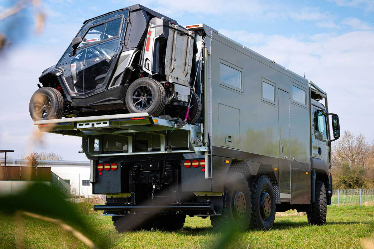 El Unicat MD56c incorpora una plataforma en la zaga que es accionada hidráulicamente. Sobre la que se puede llevar desde dos motos hasta un quad o un Side by Side (como en las imágenes). Sobre el techo del módulo vivienda hay numerosos paneles solares. Estos proporcionan energía a un conjunto de baterías de iones de litio con 24,6 kWh de capacidad con la que anuncia una autonomía el de hasta dos semanas. Y para no quedarte sin electricidad, también dispone de un generador Honda auxiliar.