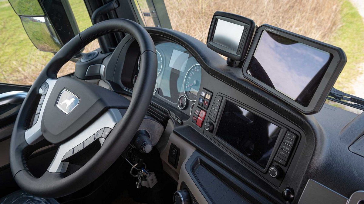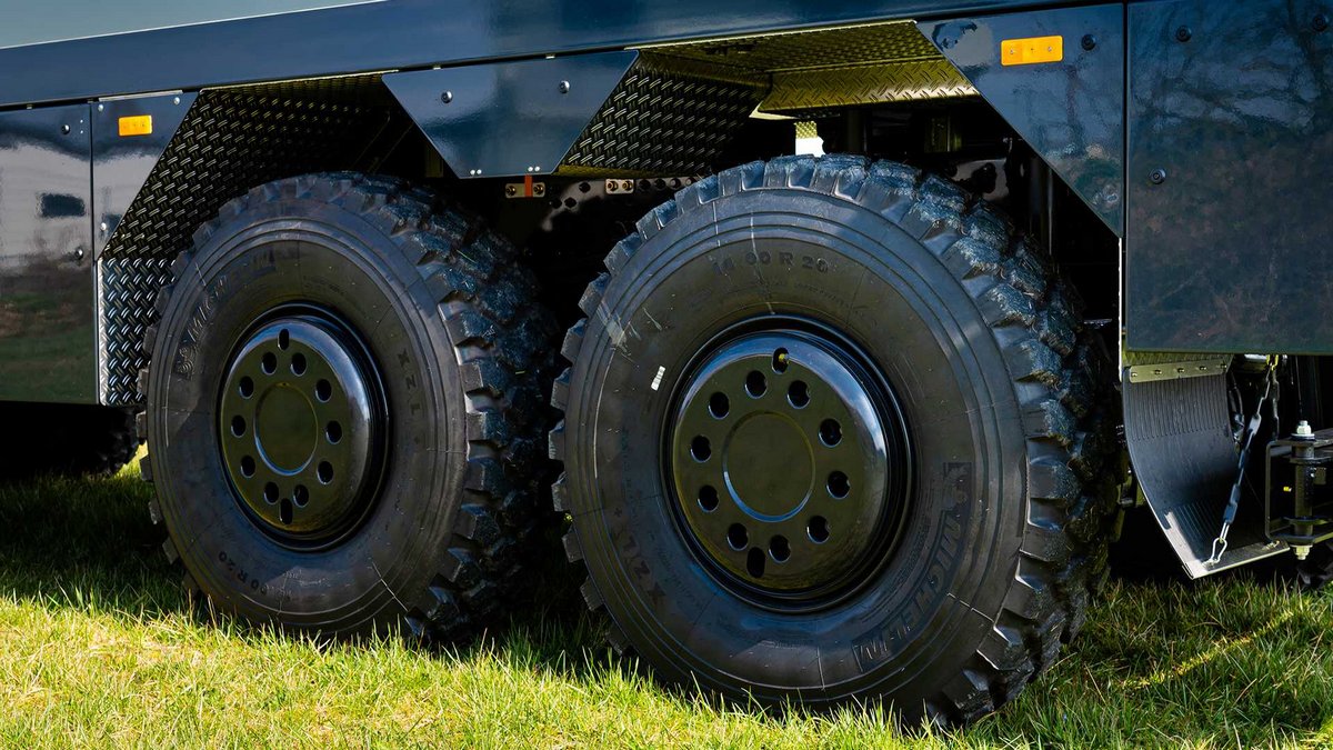 Este ‘pequeño’ apartamento descansa sobre un capaz camión todoterreno con tracción a las seis ruedas. Está equipado con un motor turbodiésel con 540 CV de potencia y una caja de cambios con 12 velocidades. Además de diferenciales bloqueables, cuenta con dirección en dos de sus tres ejes. Otro elemento clave es su sistema de inflado y desinflado remoto para los neumáticos, que cuentan con llantas beadlock para evitar destalonar.