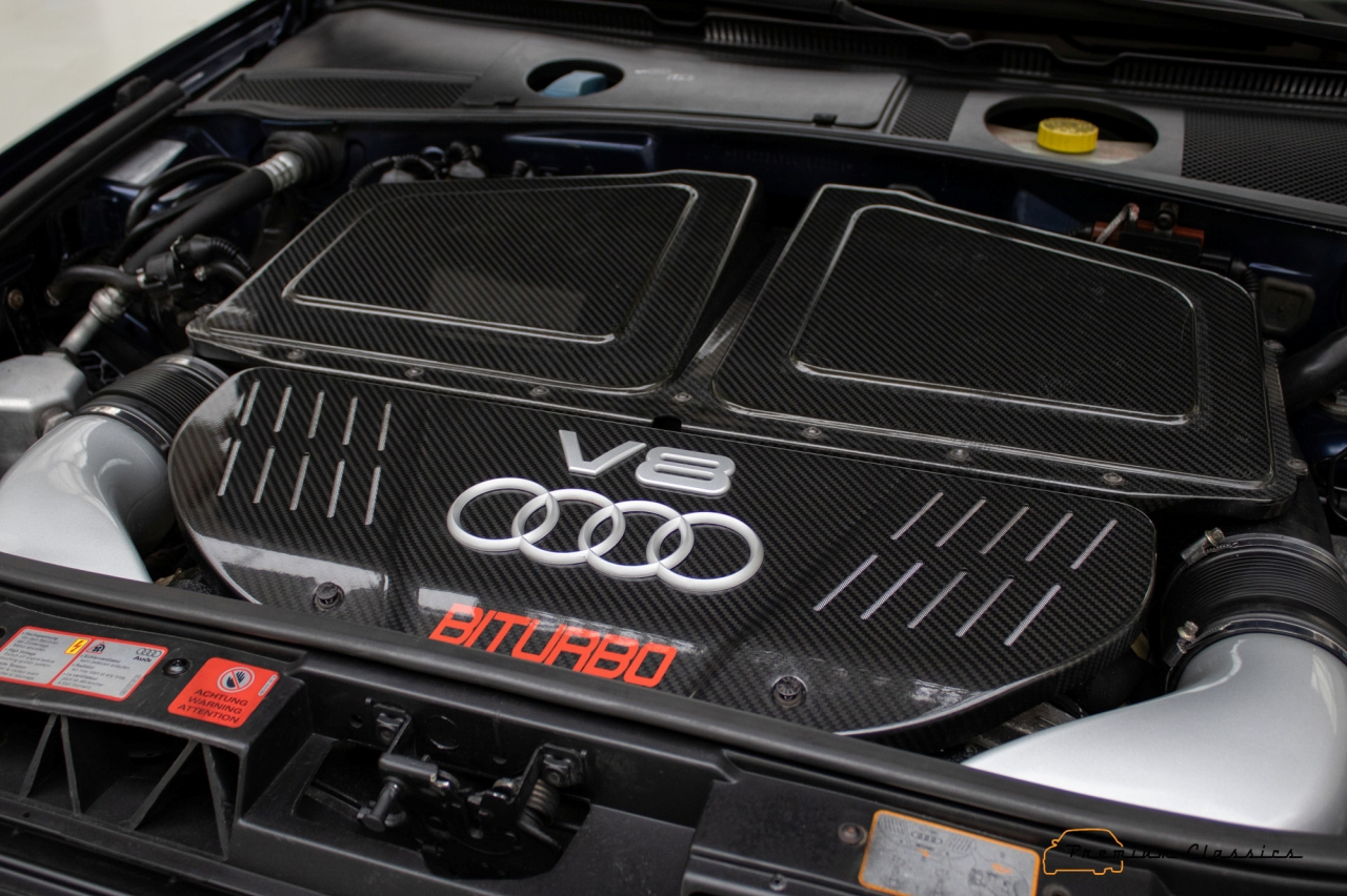 Sin embargo, el punto fuerte de este sedán deportivo era su apartado mecánico. Audi Sport tomó el motor V8 de 4.163 cm3 presente en el S6 y el A6 4.2 y le equipó una pareja de turbocompresores. El resultado eran unos respetables 450 CV de potencia y 560 Nm de par máximo (también hubo una versión RS6 Plus de 480 CV). El bloque estaba ligado a un cambio automático de cinco velocidades y a un sistema de tracción total. Esta configuración permitía un 0 a 100 km/h en 4,9 segundos y una velocidad máxima limitada electrónicamente a 250 km/h.