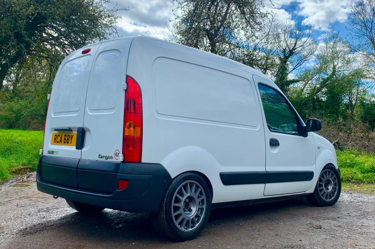 En lugar del humilde motor diésel de 1.5 litros y 70 CV con el que salió de fábrica esta versión comercial del Renault Kangoo, bajo el capó delantero ahora se esconde una mecánica de cuatro cilindros y 2.0 litros de aspiración natural que desarrolla casi tres veces la potencia original de la furgoneta. Tanto el motor y como la configuración de la suspensión delantera se han tomado prestados de un Renault Clio Sport.