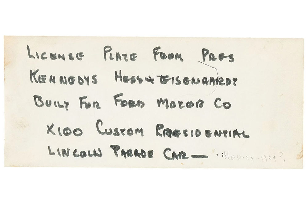 Venden las matrículas de JFK por 100.000 dólares en una subasta. El conjunto de placas de seis cifras se pusieron a la venta esta semana; se trata de las que llevaba el Lincoln en que iba John F. Kennedy cuando lo asesinaron (en 1963).