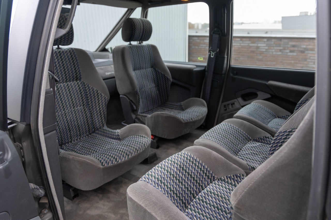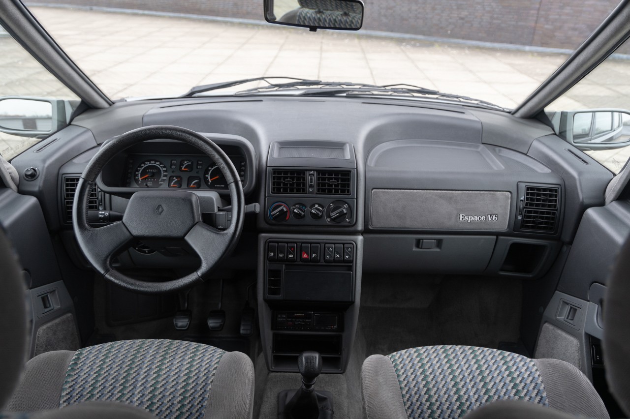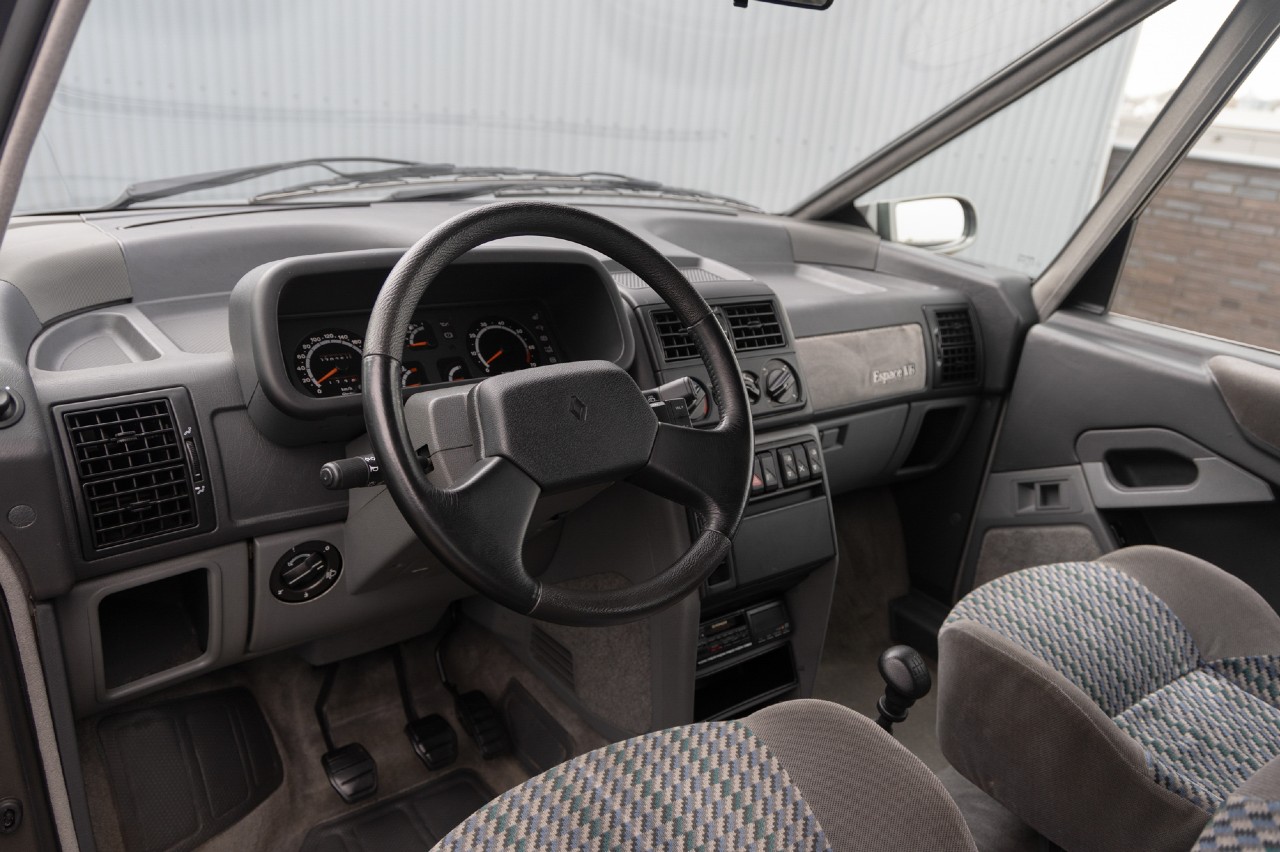 Este Espace V6 está acabado en Gris Pluron con un interior en Velours Torsade, la tapicería más lujosa disponible en la época, que iba de serie en la versión V6. Según el folleto de 1991, el interior de siete plazas del monovolumen francés se podía configurar en varias posiciones, de dos a siete asientos.
