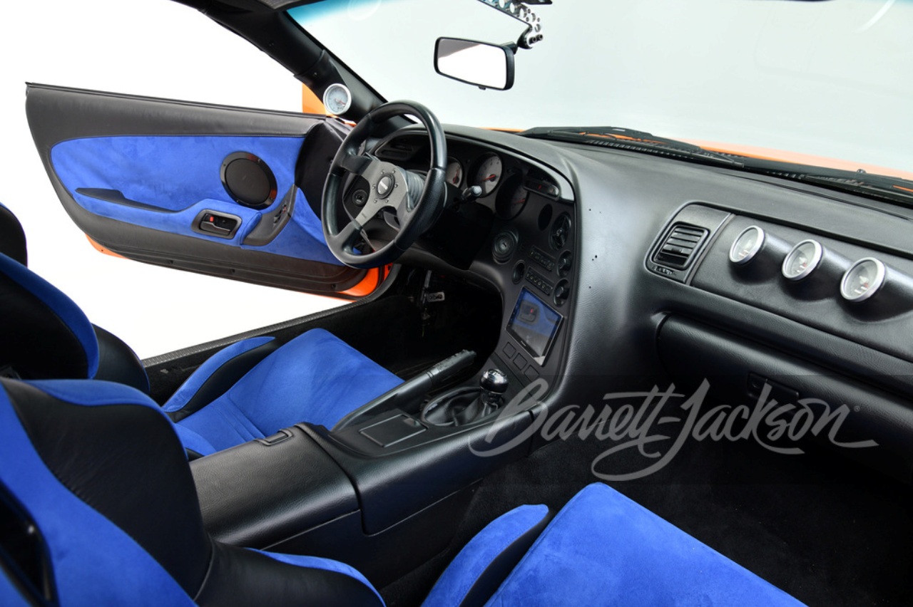 Bajo el capó, el Toyota Supra original de ‘The Fast & The Furious’ está equipado con un motor 2JZ-GTE biturbo totalmente de fábrica. La potencia se envía al tren trasero a través de un cambio automático de cuatro velocidades. También incluye la pintura Lamborghini Diablo con su decoración específica, llantas Dazz Motorsport Racing, capó TRD y un alerón de aluminio. El interior está completamente modificado, con medidores adicionales y tapicería en negro y azul.