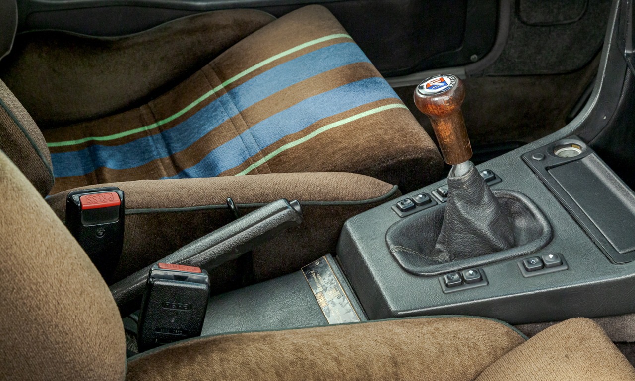 En el interior, mientras tanto, encontramos asientos deportivos tapizados terciopelo Alpina original de color marrón con franjas azules y verdes. Están acompañados de un cuadro de instrumentos Alpina, un volante Momo forrado en cuero y un pomo del cambio de madera. Incluso hay una placa numerada en la consola central, cristales con aislamiento térmico, espejos y ventanillas eléctricas y un techo corredizo.