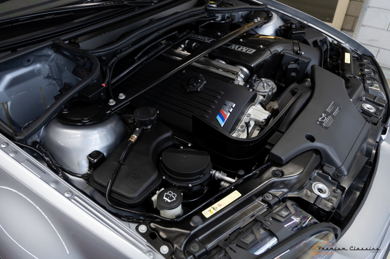 Por supuesto, está equipado con el venerado motor S54 de aspiración natural, seis cilindros en línea y 3.2 litros. El bloque desarrolla 360 CV de potencia y 370 Nm de par, lo que fue un incremento de 17 CV y 5 Nm sobre las especificaciones del M3 (E46) estándar. También se aligeró su peso en unos 120 kilos empleando fibra de carbono, cristales más finos, asientos aligerados y reduciéndola cantidad de componentes electrónicos disponibles.