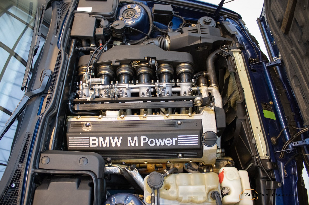 Al levantar le capó, solo mirar el motor es ya una gozada. Tenemos un seis cilindros en línea de 3.8 litros que produce 340 CV. Por supuesto, libre de cualquier sobrealimentación. El sonido del motor es realmente embriagador. Dinámicamente, este M5 demostraba un comportamiento intachable, gracias a su distribución de pesos de 50/50. También incluye discos de freno ventilados.