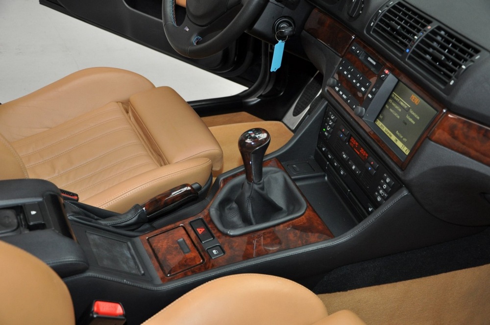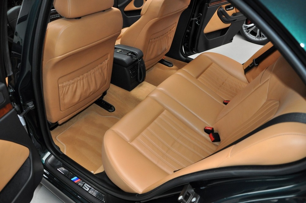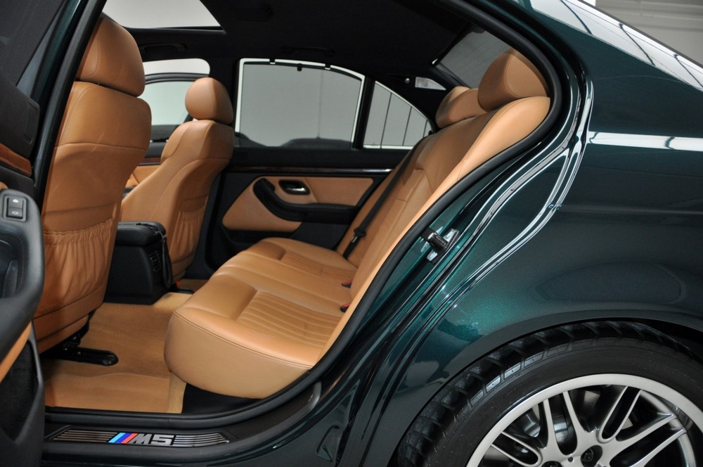 El concesionario que tiene a la venta un BMW M5 E39 de 1999 con 35.000 km en el marcador indica que está rematado en un verde metalizado, concretamente, en Oxford Green Metallic. Un tono que contrasta con el habitáculo, tapizado en cuero Heritage Caramel Nappa con inserciones en madera. Este ejemplar está equipado con numerosas opciones, como el techo solar practicable, la cortina trasera eléctrica, el teléfono móvil integrado en el reposabrazos, el sistema de navegación con sintonizador de TV o un cargador de seis CD.