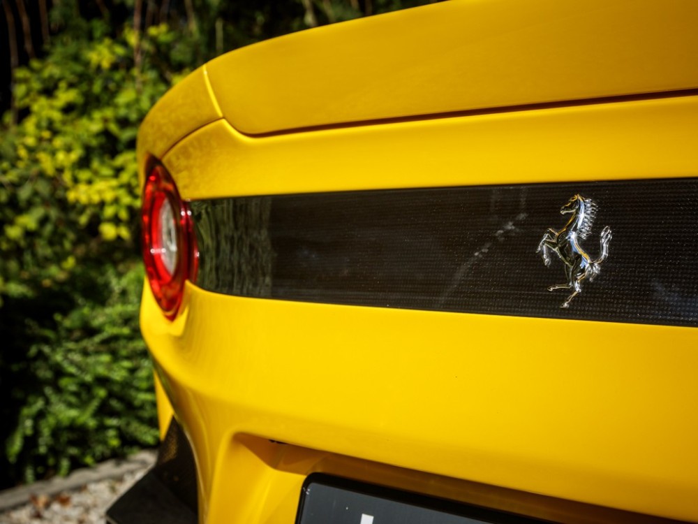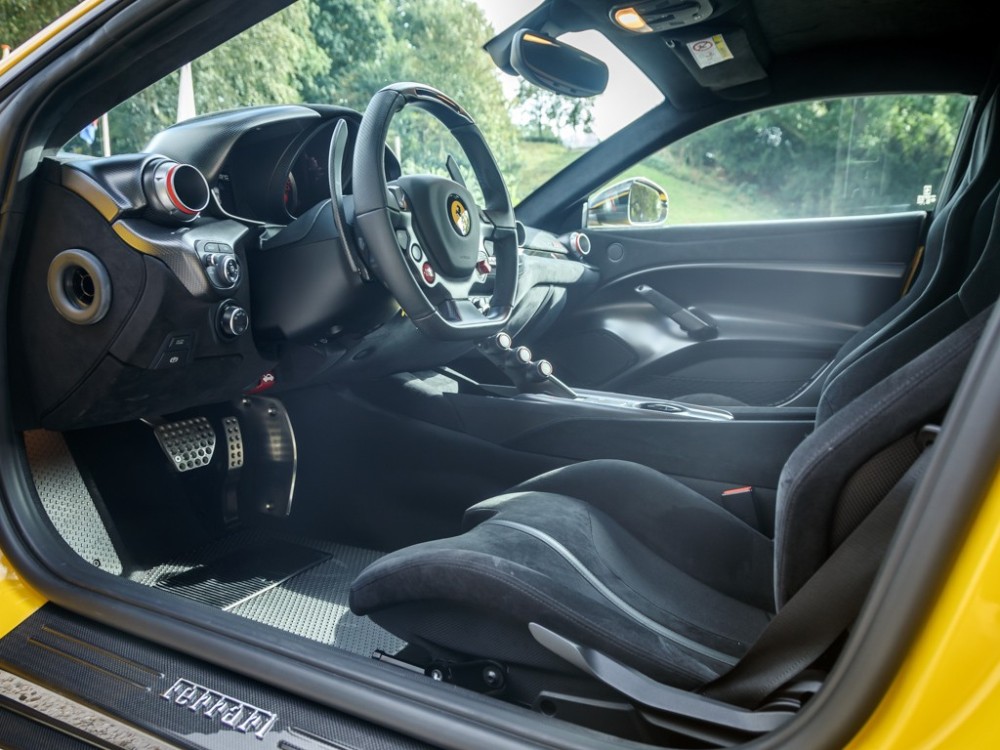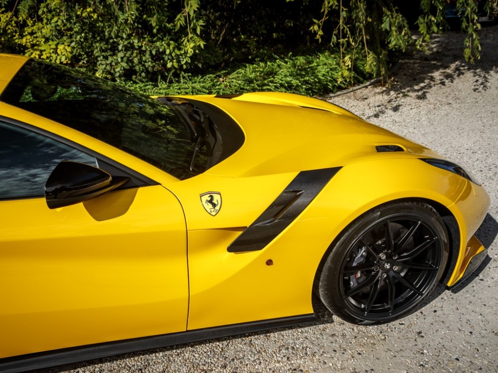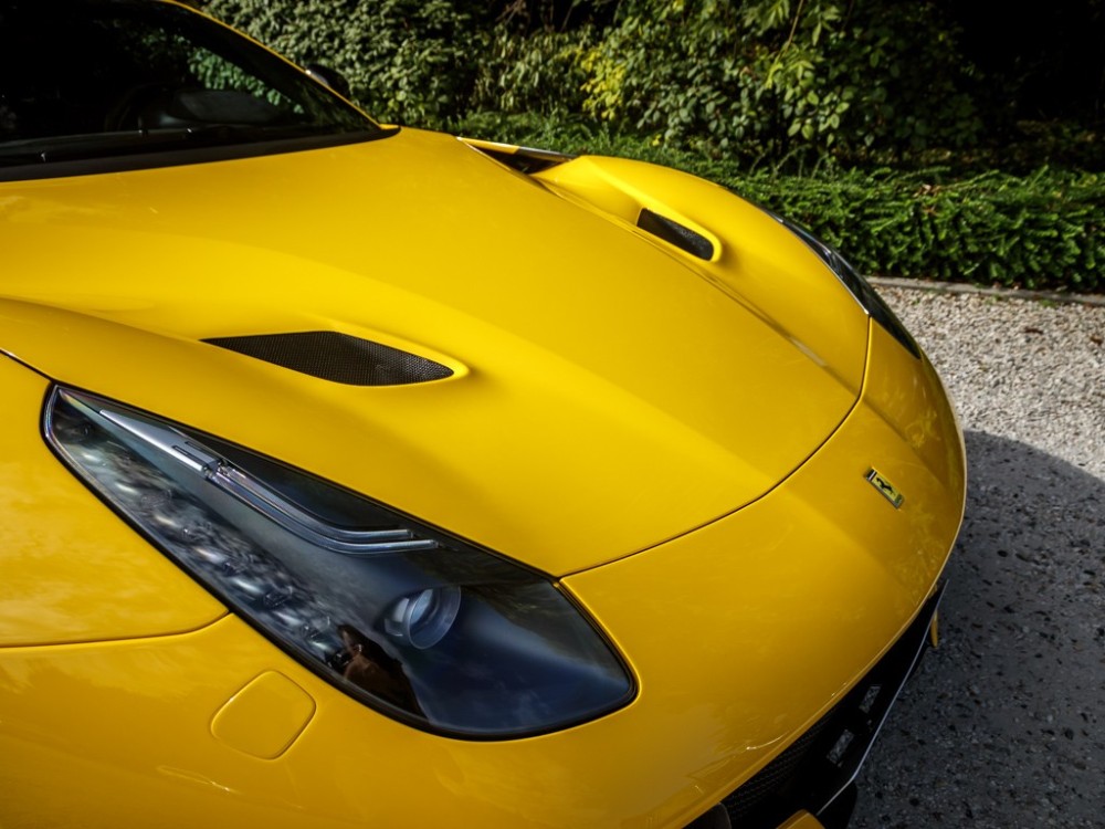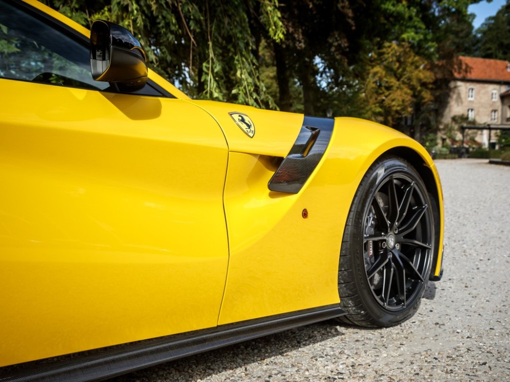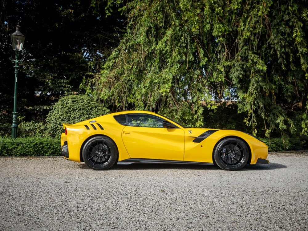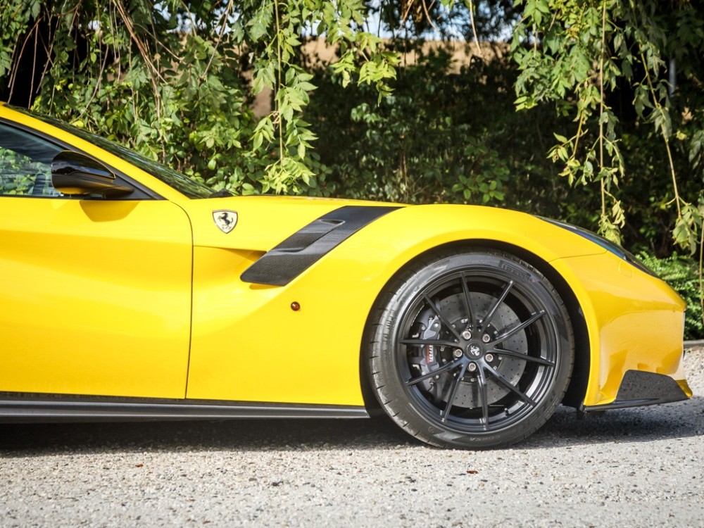 Este Ferrari F12tdf está terminado en el característico color amarillo de la compañía italiana e incorpora diferentes inserciones de fibra de carbono visible a lo largo de la carrocería, así como un set de llantas de aleación de 20 pulgadas terminadas en negro. El F12tdf incluye un sistema adaptativo de amortiguación, el paquete de fibra de carbono para el interior y un sistema de audio de alta definición.