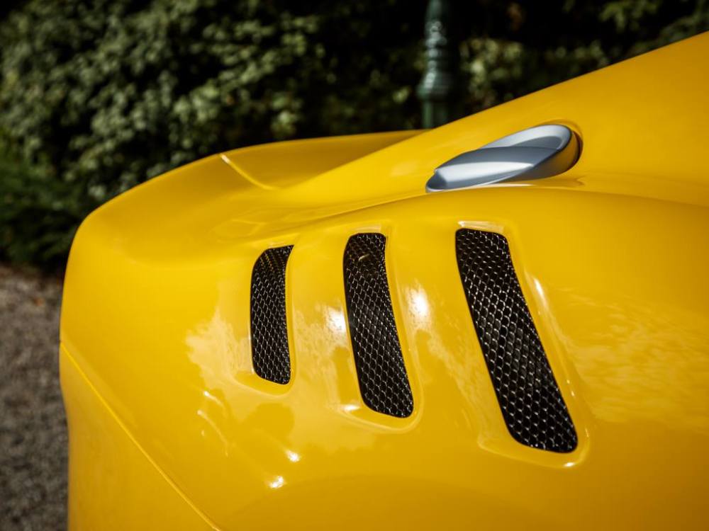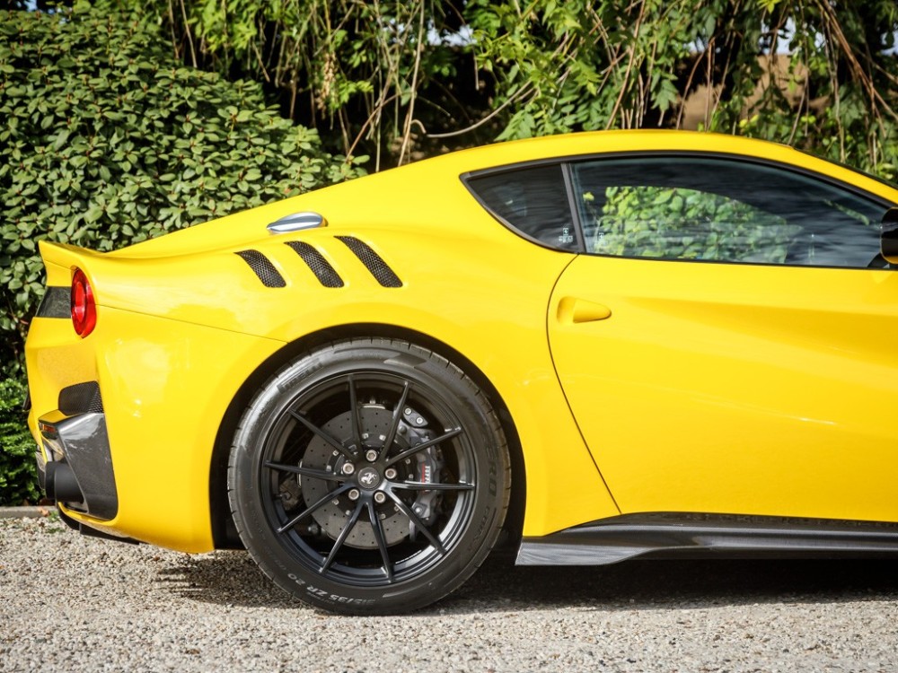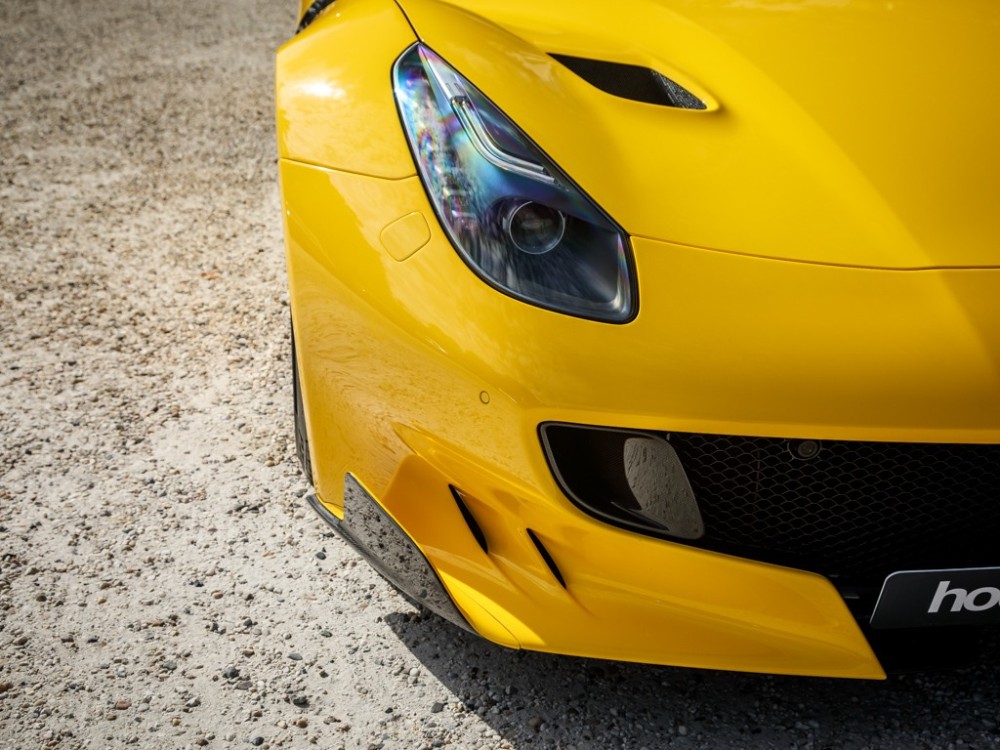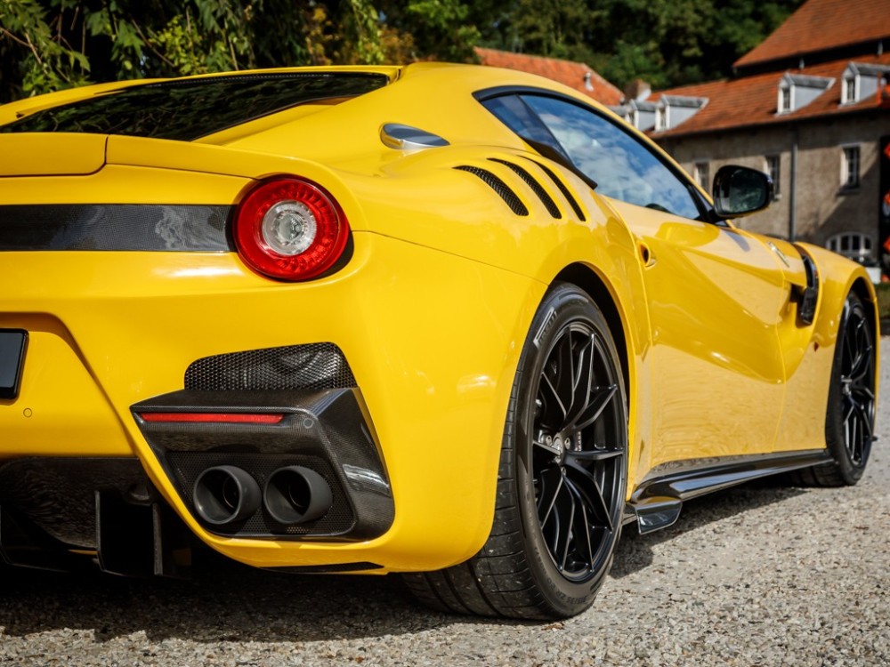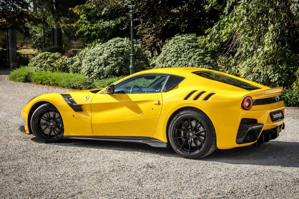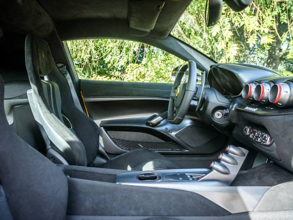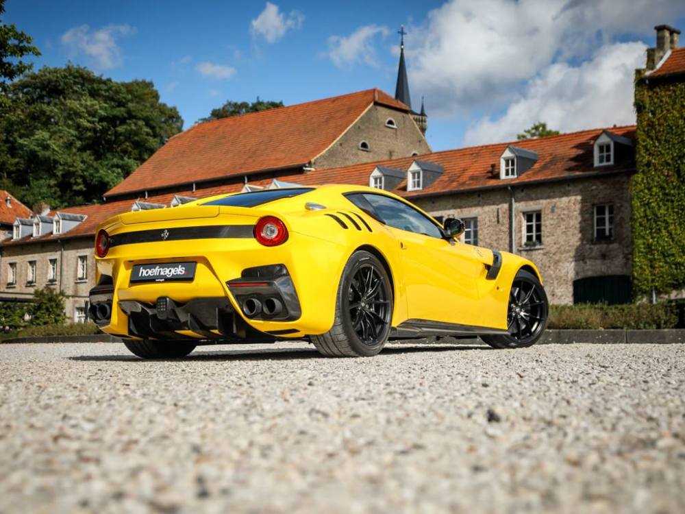 Este Ferrari F12tdf está terminado en el característico color amarillo de la compañía italiana e incorpora diferentes inserciones de fibra de carbono visible a lo largo de la carrocería, así como un set de llantas de aleación de 20 pulgadas terminadas en negro. El F12tdf incluye un sistema adaptativo de amortiguación, el paquete de fibra de carbono para el interior y un sistema de audio de alta definición.