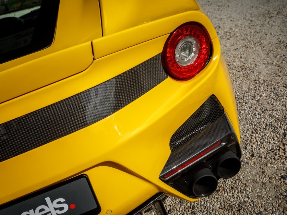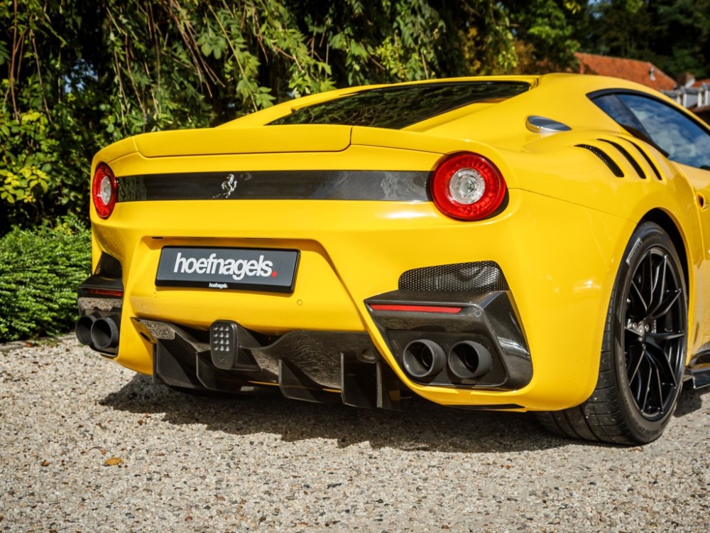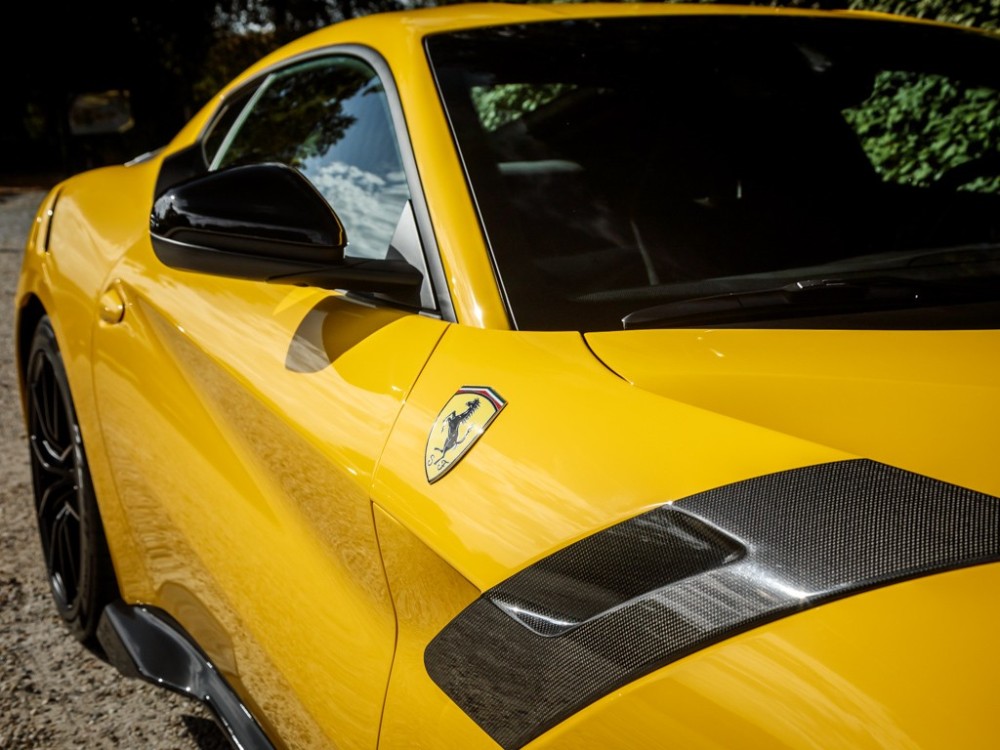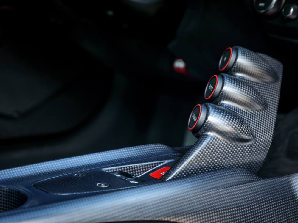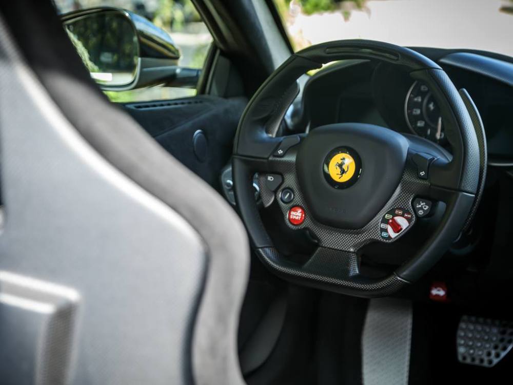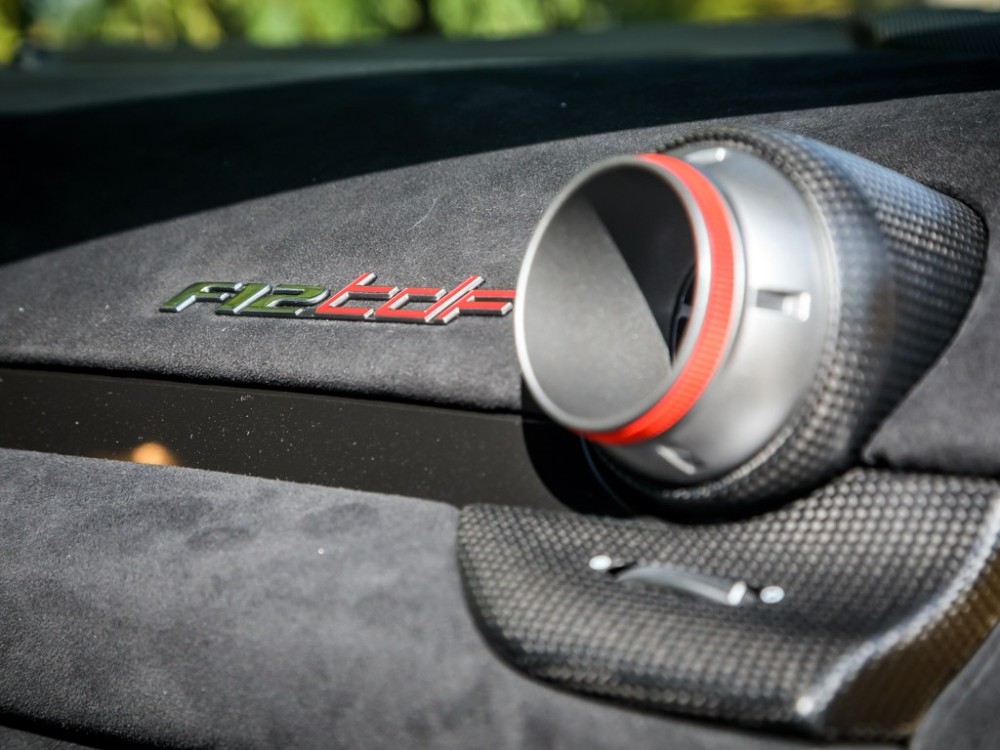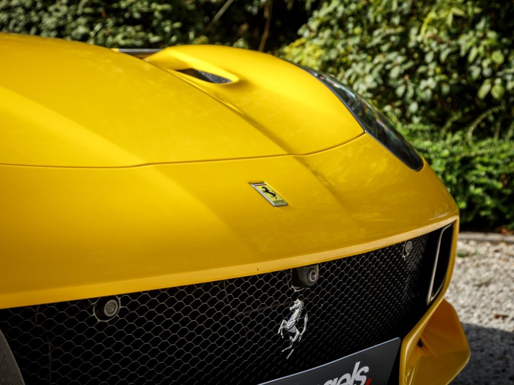 Este Ferrari F12tdf está terminado en el característico color amarillo de la compañía italiana e incorpora diferentes inserciones de fibra de carbono visible a lo largo de la carrocería, así como un set de llantas de aleación de 20 pulgadas terminadas en negro. El F12tdf incluye un sistema adaptativo de amortiguación, el paquete de fibra de carbono para el interior y un sistema de audio de alta definición.