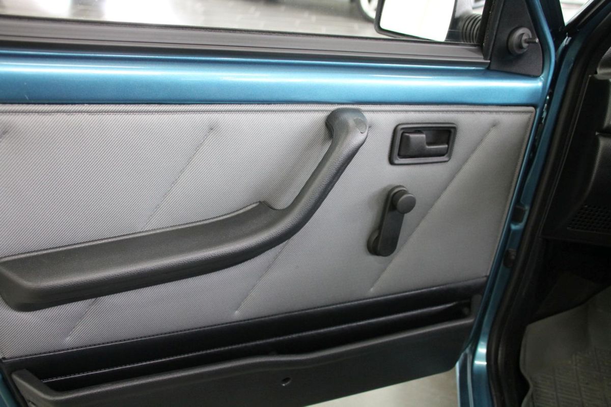 Terminado en azul metalizado, la carrocería de cinco puertas de este Fiat Uno está impoluta, tanto la pintura como las protecciones plásticas de los laterales y los parachoques. Incluso los pasos de rueda están completamente limpios. El interior presenta una tapicería de cuadros y todos los paneles sin ningún signo de desgaste. No incluye ningún tipo de equipamiento destacado, ya que es un ejemplar bastante simple del Uno en acabado Fire.