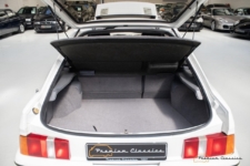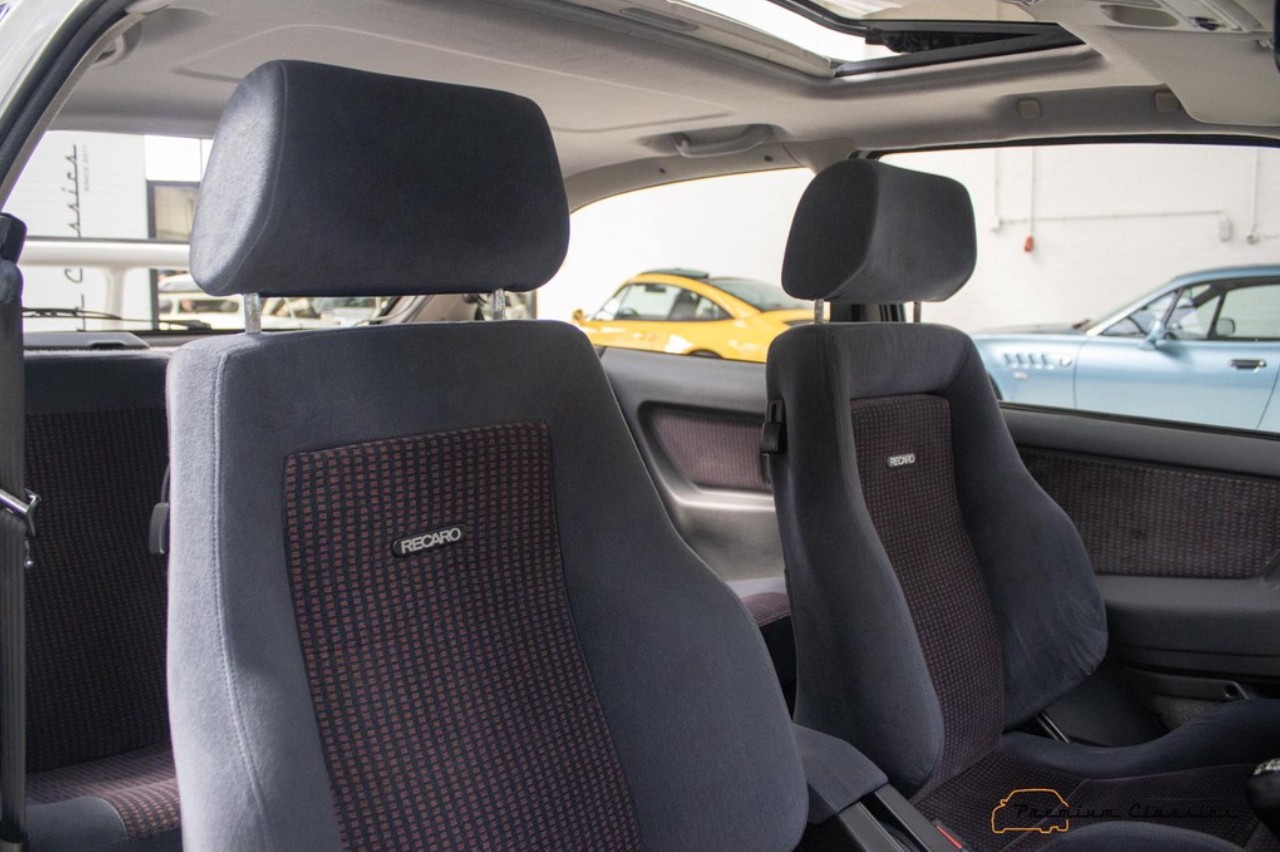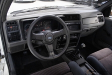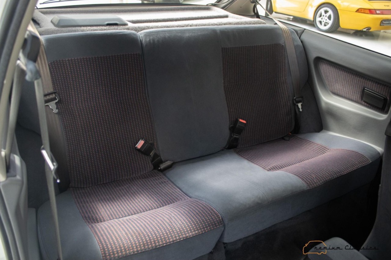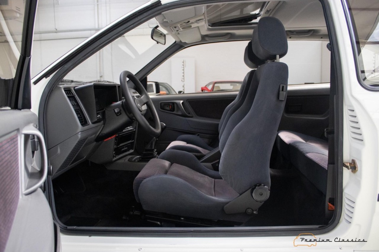Esta unidad en particular fue matriculada nueva en 1987 y está terminada en el icónico color blanco exterior. Reposa sobre un juego de llantas de diseño multirradio con neumáticos Hankook. En el interior, mientras tanto, hay asientos de tela gris con un patrón de color rojo en el centro, a juego con los paneles de las puertas. También un volante de tres radios y un techo solar manual.