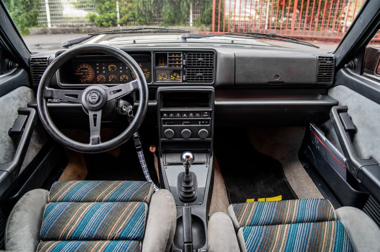 Terminado en pintura gris, este clásico de Lancia presenta detalles en rojo y logotipos “HF” en las puertas. También hay unas llantas originales de 15 pulgadas terminadas en el mismo tono que la carrocería, así como un interior de tela gris con un patrón de varios colores en los asientos y los paneles de las puertas.