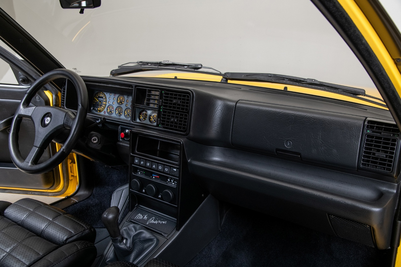 La carrocería está terminada en la pintura Ferrari Fly Yellow, color conocido como ‘Giallo Ferrari’. Se trata de una de las solo 295 unidades terminadas en esta pintura. El exterior recibió una serie de mejoras, con unas nuevas rejillas frontales, un capó rediseñado, un spoiler de techo, nuevas llantas de cinco tornillos y un nuevo sistema de escape. Dentro, este Lancia Delta Integrale Evoluzione de 1992 luce un habitáculo de cuero negro.