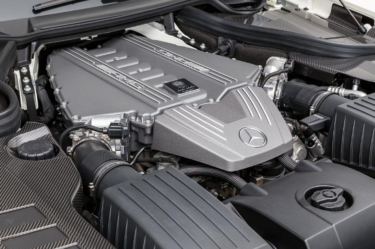 Además, hay que destacar la mecánica del Mercedes-Benz SLS AMG Black Series. Monta el mismo motor 6.2 V8 atmosférico del SLS convencional, pero cuenta con cambios como los árboles de levas modificados, geometría de levas adaptada, etc. para llegar hasta los 622 CV y los 635 Nm de par máximo. Combinado con la caja de cambios automática de doble embrague y siete relaciones es capaz de acelerar de 0 a 100 km/h en 3,6 segundos, así como de alcanzar una velocidad máxima de 315 km/h.
