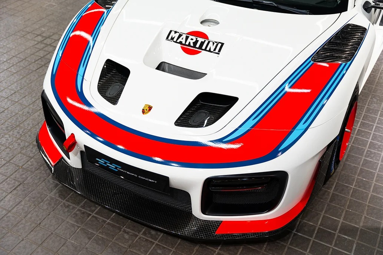 Este Porsche 935 Martini a la venta cuenta con nuevos paneles en fibra de carbono ligero, así numerosos elementos elaborados en fibra de carbono, como el splitter delantero, las rejillas de ventilación delanteras, los retrovisores exteriores y el enorme alerón trasero. El vehículo se ofrece a través de Contempo Concept HK Motors y sólo ha recorrido 51 kilómetros