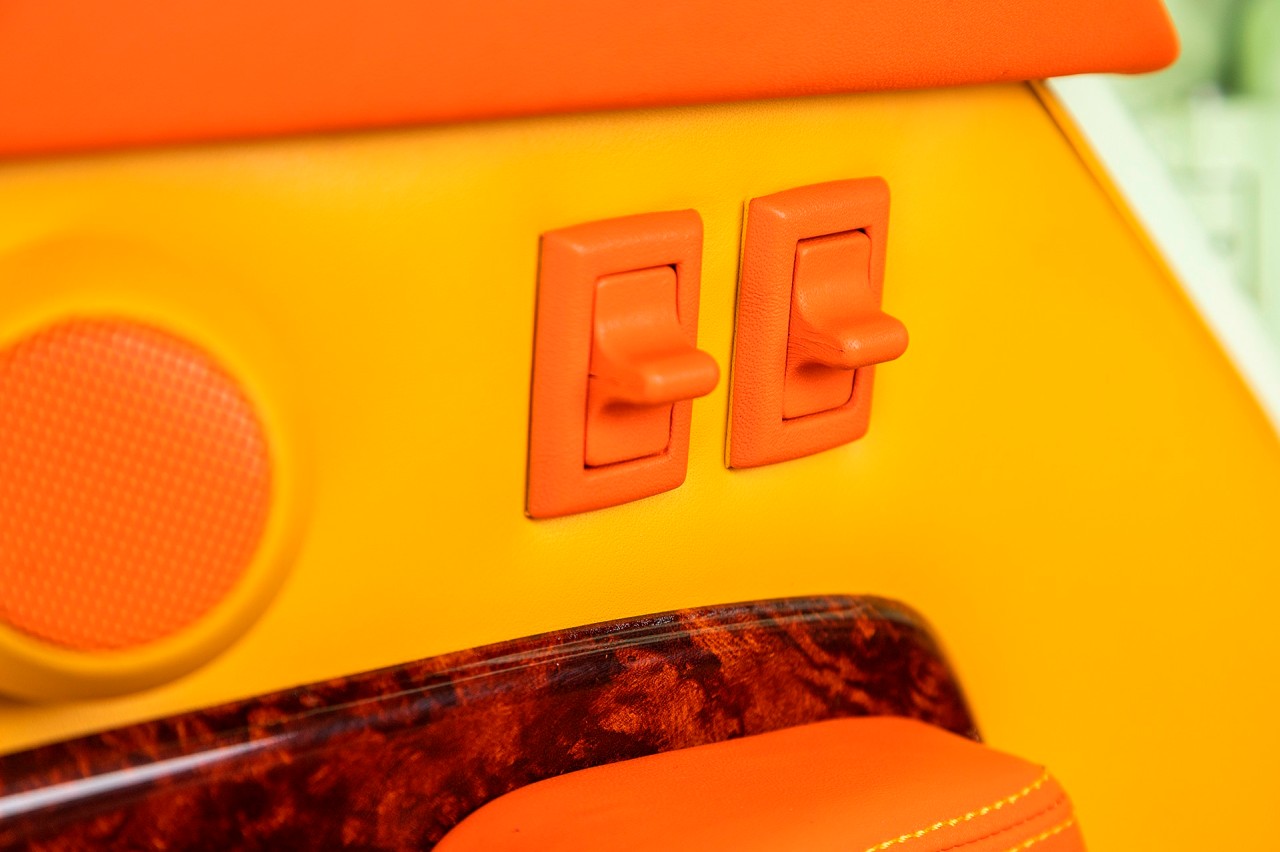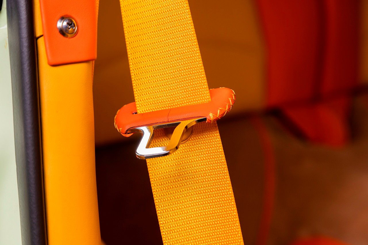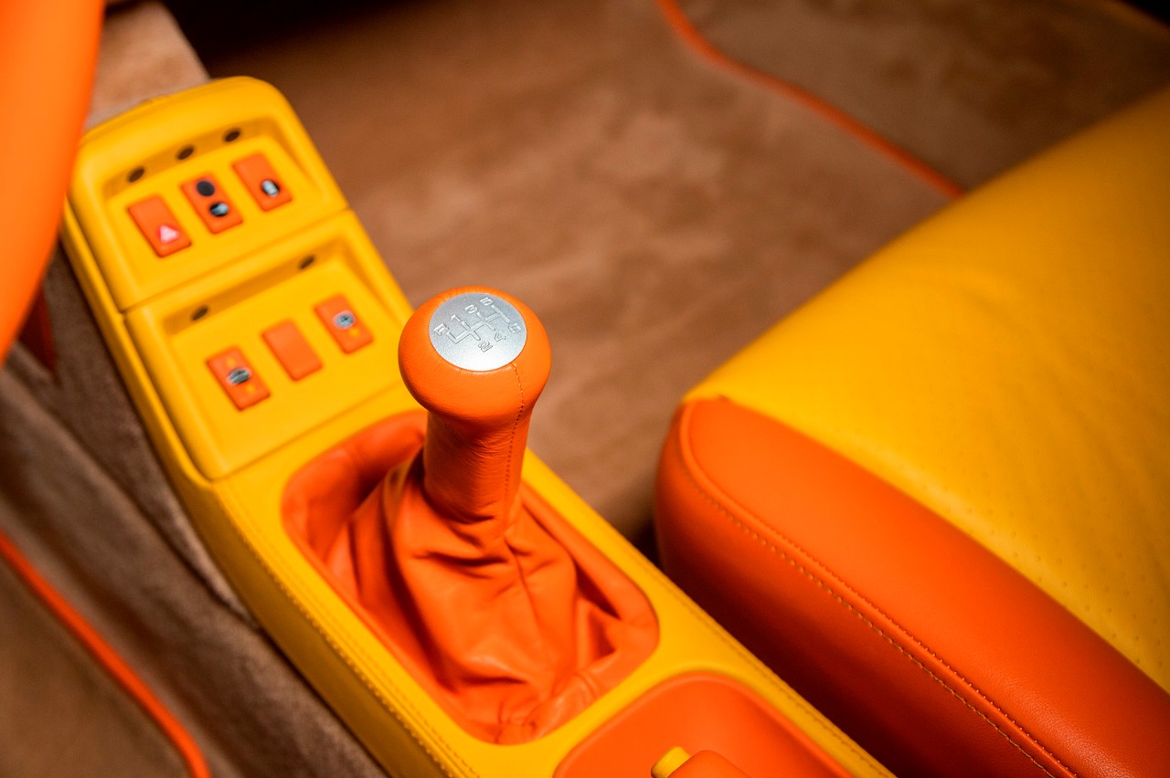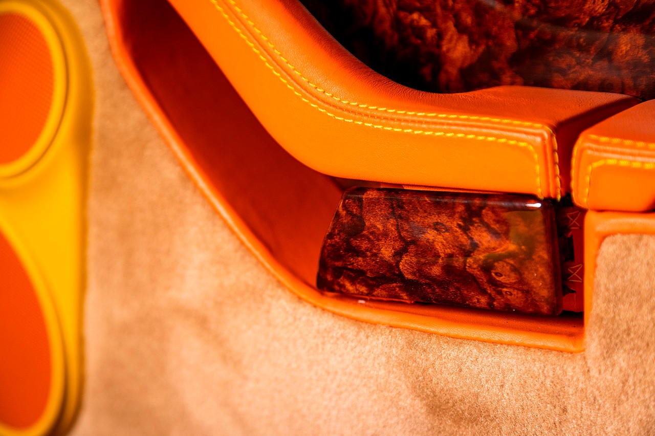El habitáculo está terminado en naranja y amarillo, con paneles de madera en contraste, mientras que la moqueta tiene un tono bronceado que también se diferencia del resto. También encontramos unos asientos con las iniciales NMS del propietario bordadas en los reposacabezas, así como una larga lista de piezas forradas en cuero. Este material está presente en diferentes colores, desde las hebillas de los cinturones hasta los interruptores.