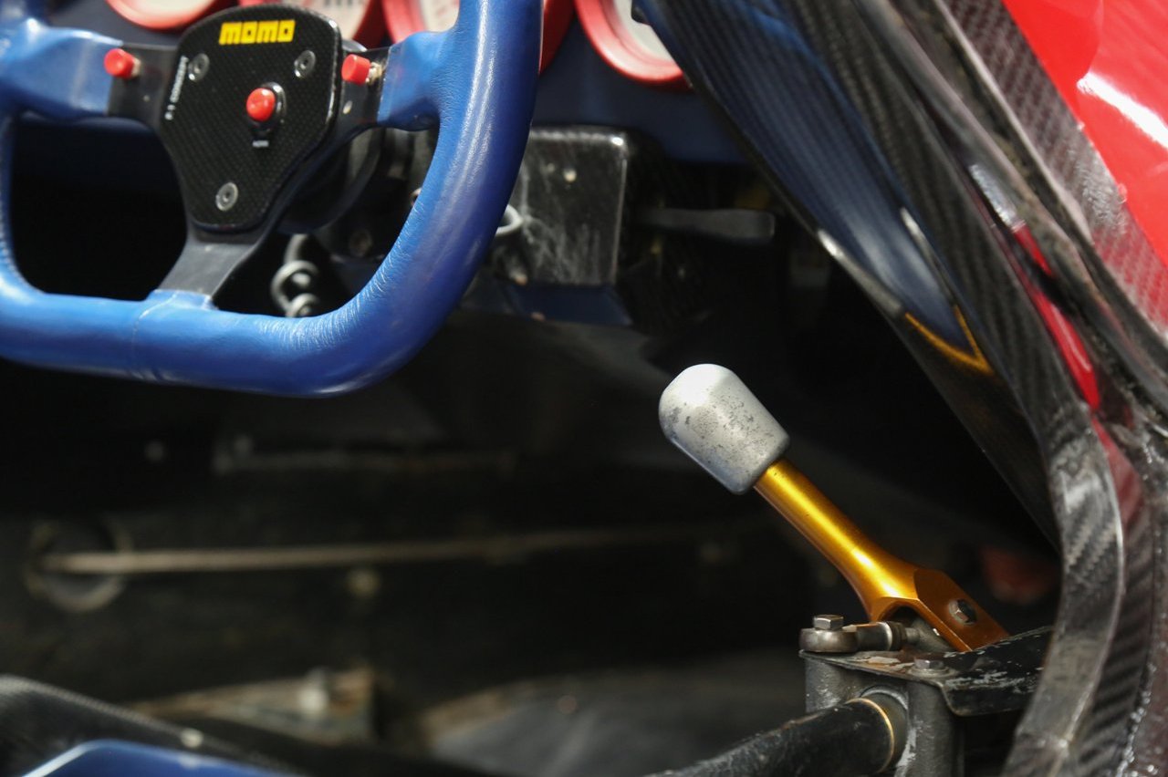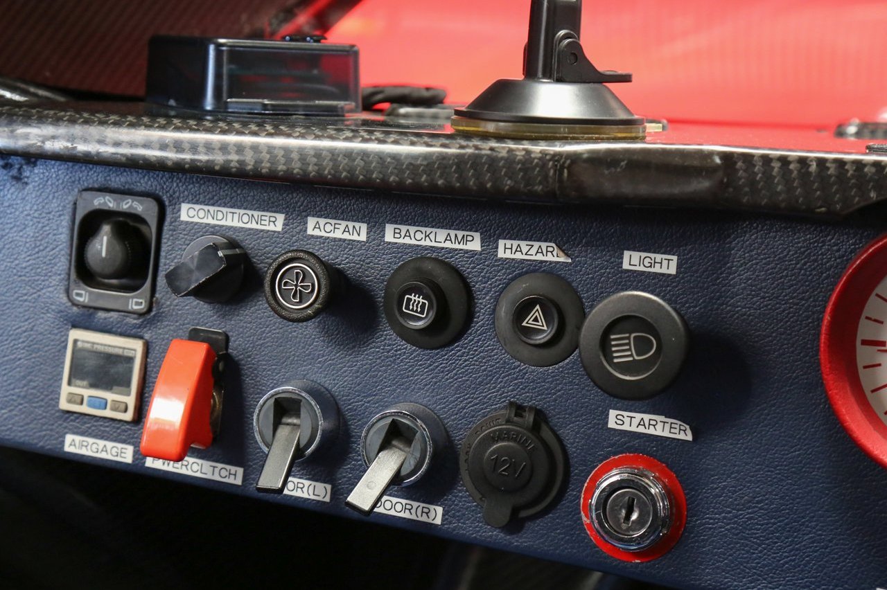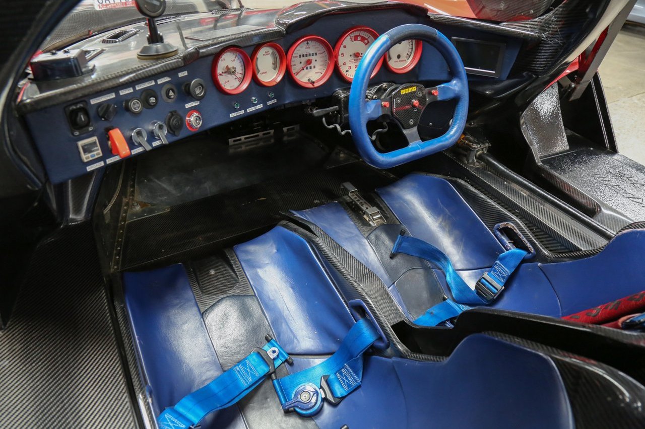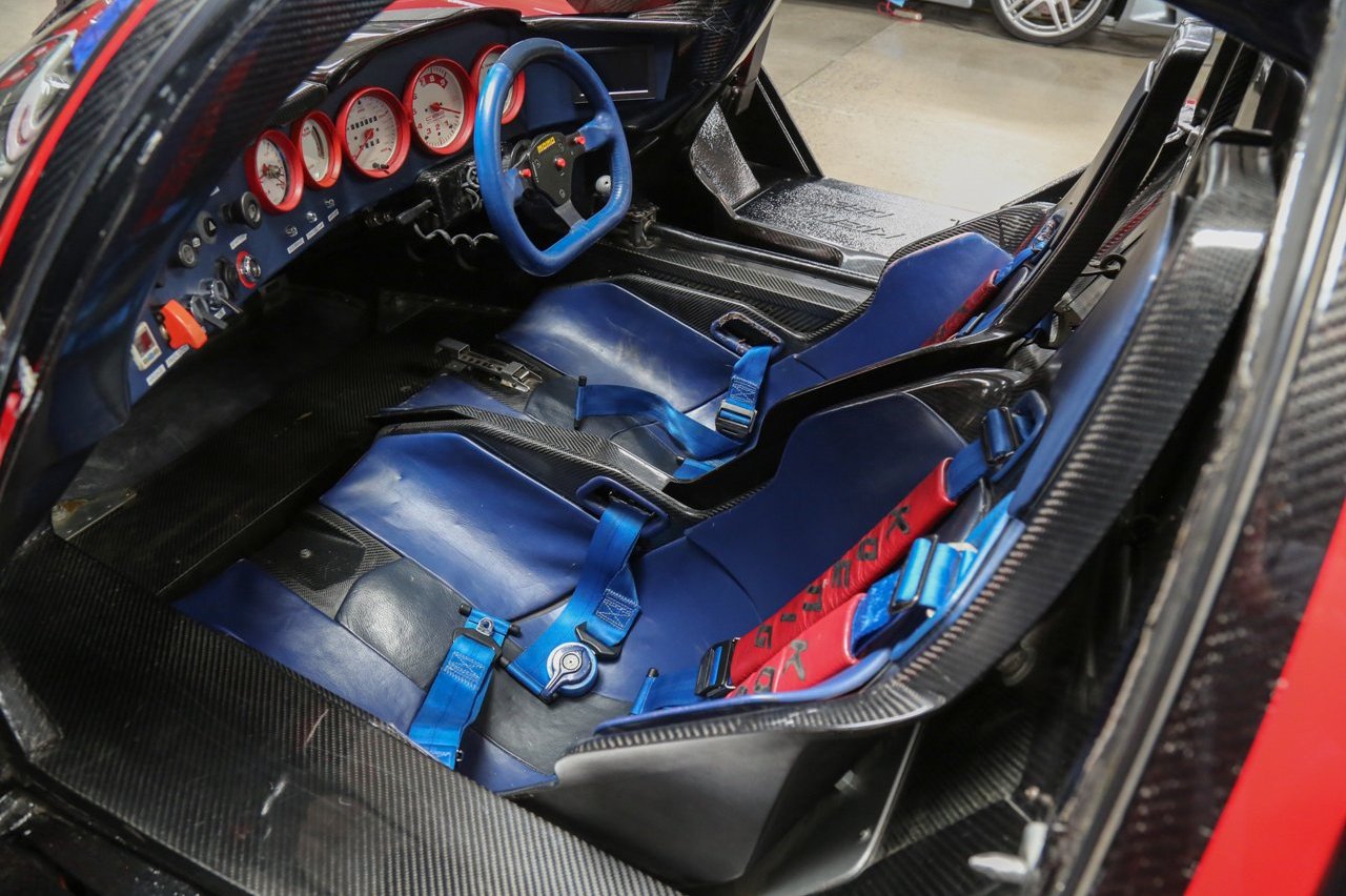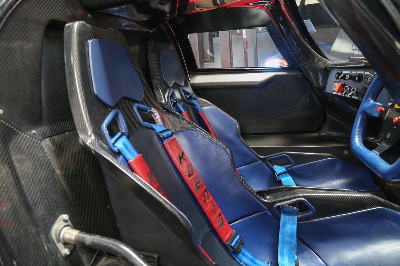 Como resultado de estos cambios, se tuvo que modificar el piso para garantizar un equilibrio aerodinámico perfecto. También se instaló una cubierta para el motor de plexiglás para facilitar el acceso al compartimento del motor durante los trabajos de mantenimiento. Dentro, el chasis de fibra de carbono sigue expuesto y está acompañado de cuero de color azul para los asientos y el volante. También equipa arneses de seguridad con cinco puntos de anclaje, relojes con marcos en color rojo y un volante MOMO de competición.
