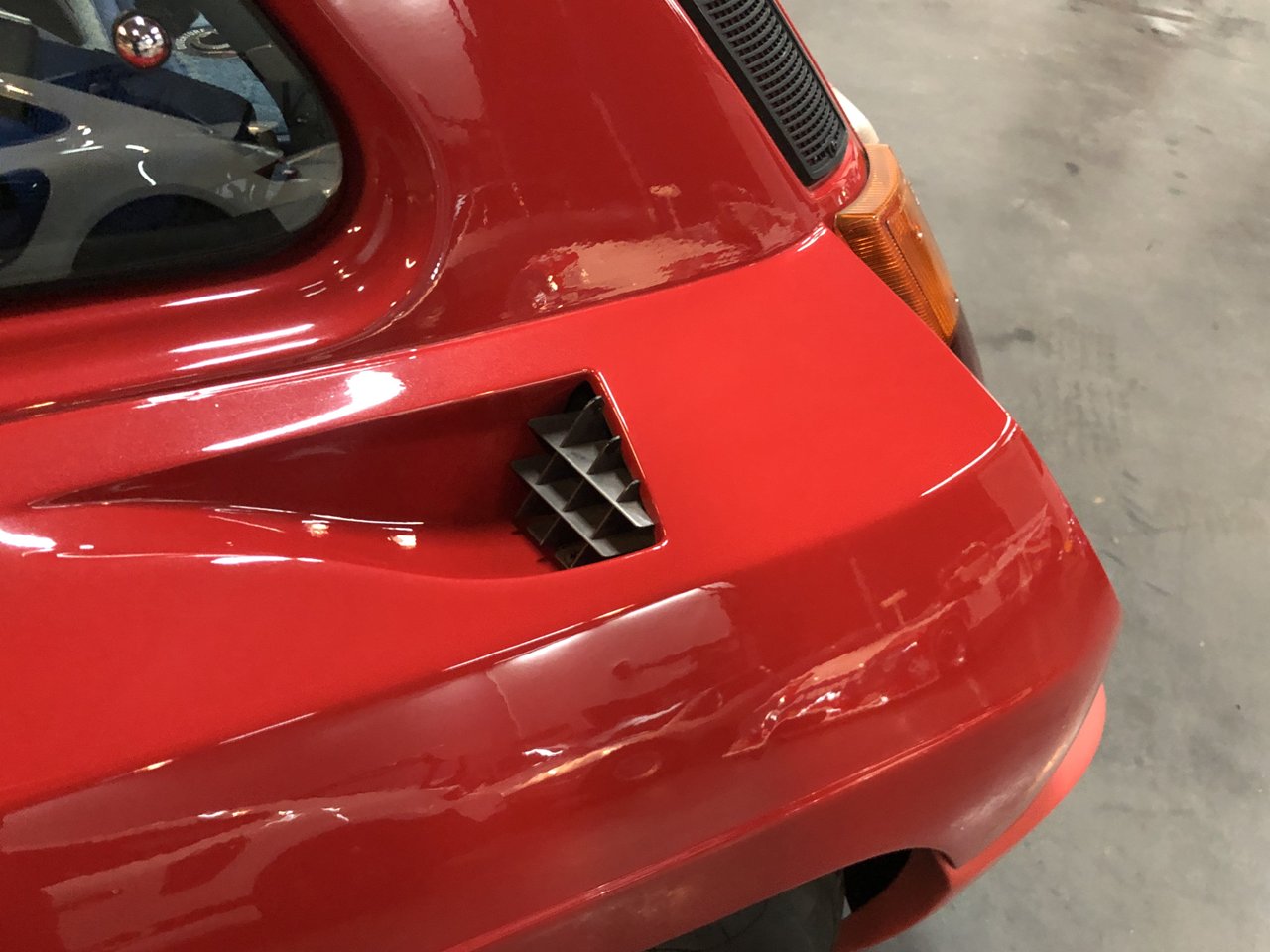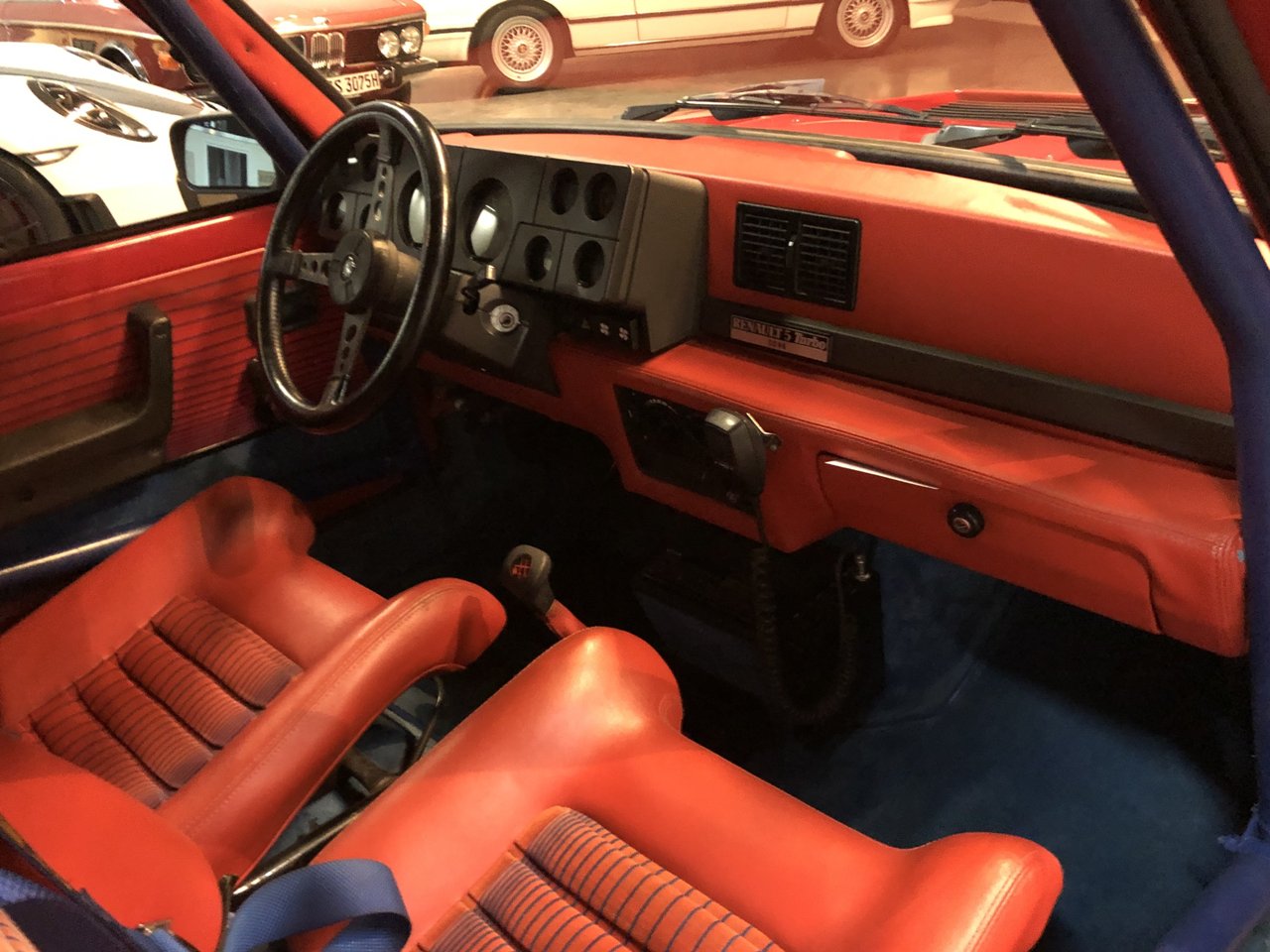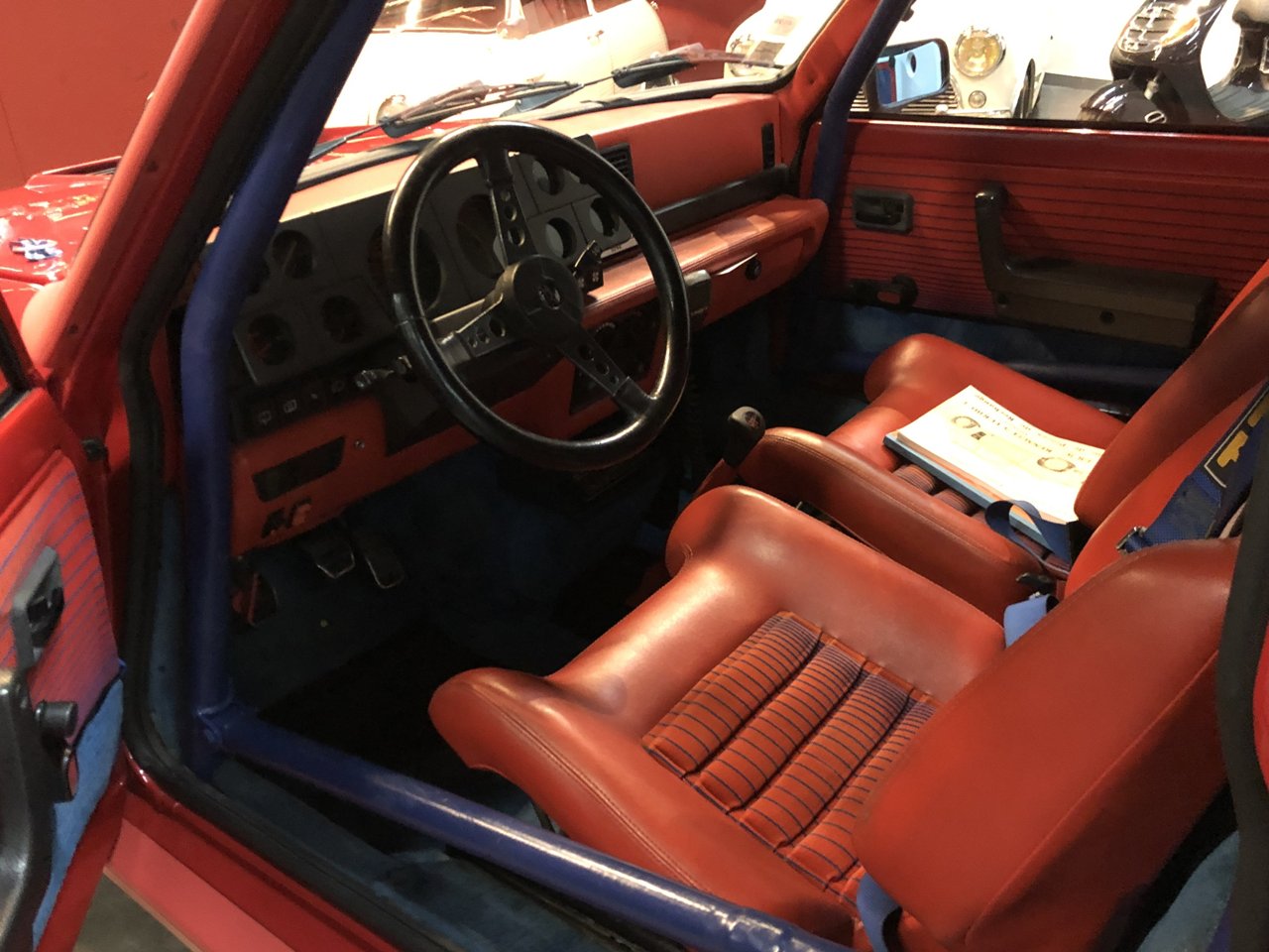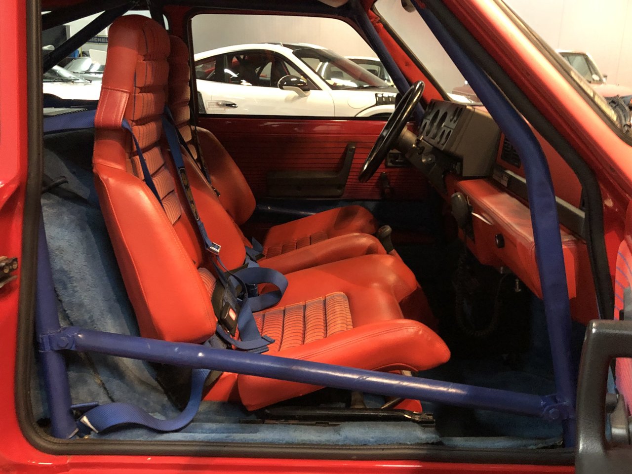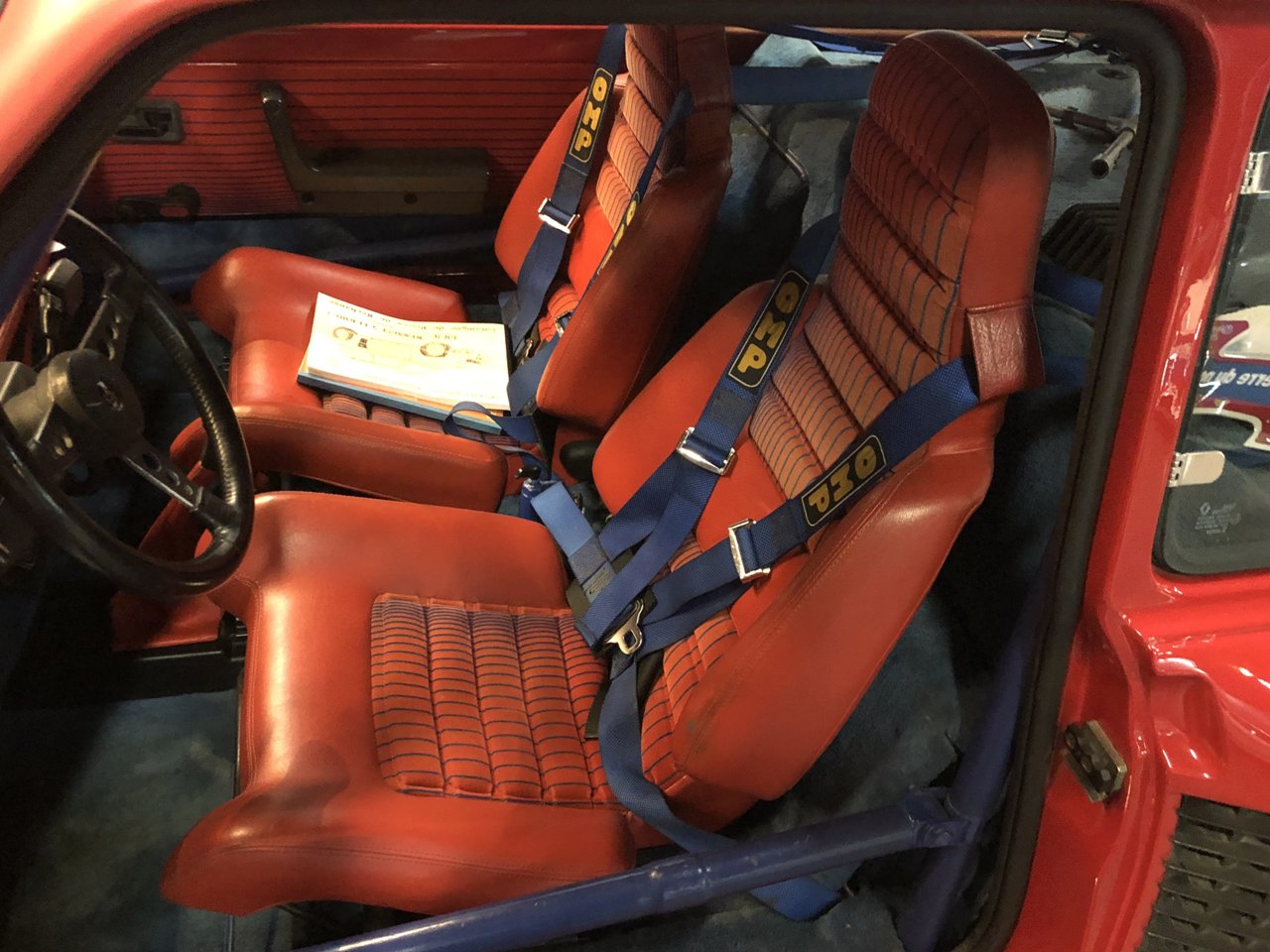 Su estado de conservación es perfecto, con una carrocería terminada en color rojo sobre un interior que combina el color rojo y el azul. Los asientos deportivos incluyen arneses de seguridad OMP con cuatro puntos de anclaje, mientras que una jaula de seguridad mantiene la forma de la cabina intacta en caso de accidente.